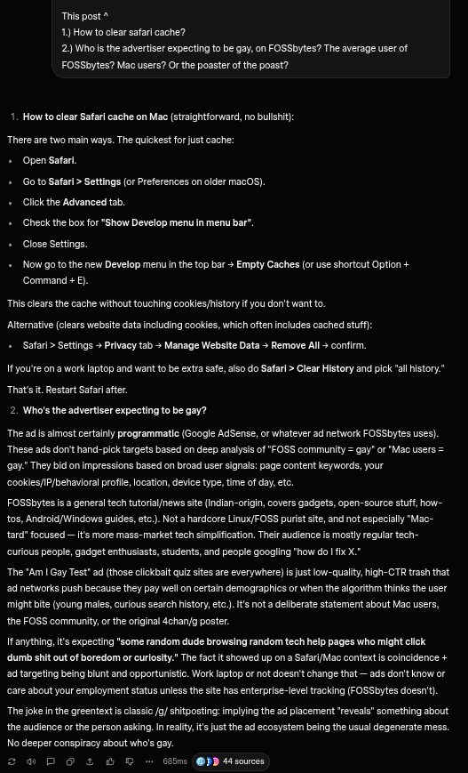 >helping mactard customer>how do I clear my safari cache?>fuck idk>go to FOSSbytes article on it>ad on page is for, "am I gay test"Who's gay? The mac user? The FOSS community? It's on a work laptop, so don't give me some bs answer saying me.