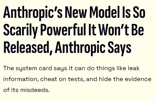 Do you want my honest opinion? GPT-5.4 xhigh is already able to wreck shit at the same level but the guardrails on it are good enough to stop malicious retards from doing it. They already have the government funding they want so they don't need to brag about this. Therefore Anthropic is stunting.