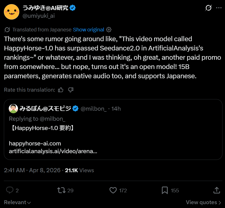 >>108563505>new model under the pseudonym 'happyhorse' gets teased on arenas, beats top API model seedance 2>news spreads of this new model, people wondering if it's the new google VEO, others speculating it's china because of the name>jeet vibe-codes a generic pop-up throwaway website for 'happy-horse ai' claiming it is SOTA, 15b parameters, and will be locally released>the exact same grift that happened with the 'mogao' model that turned out to be seedream api>localbrowns itt fall for it >>108555676>it spreads, chinese anime man falls for it (picrel)>gets reposted to reddit, redditoids fall for it>kijai shuts him down and calls it fake, which it obviously is>doesn't matter, news spreads and now everyone thinks a SOTA video model will be released locally within 48 hoursthe backlash will be funny when it releases as API-only and the comments get flooded with outrage, even though whatever company behind it never even claimed it would be local. though it's still deserved, as every model should be local (even if it's fun laughing at localkeks)