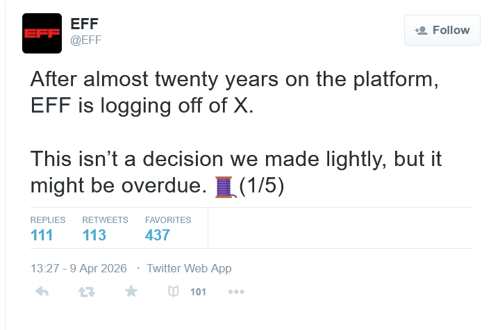 It is over for Musk, EFF just left X, formerly Twitter.com