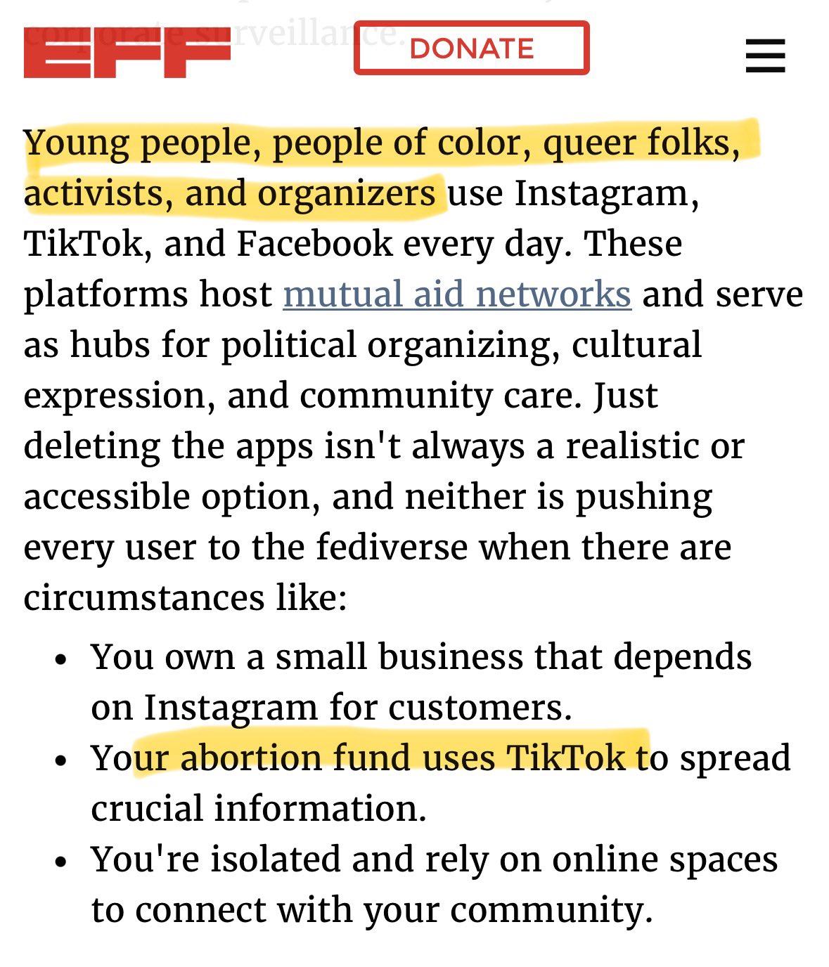 >>108567346>Young people, people of color, queer folks, activists, and organizers use Instagram, TikTok, and Facebook every day. These platforms host mutual aid networks and serve as hubs for political organizing, cultural expression, and community care.LMAO trannyware