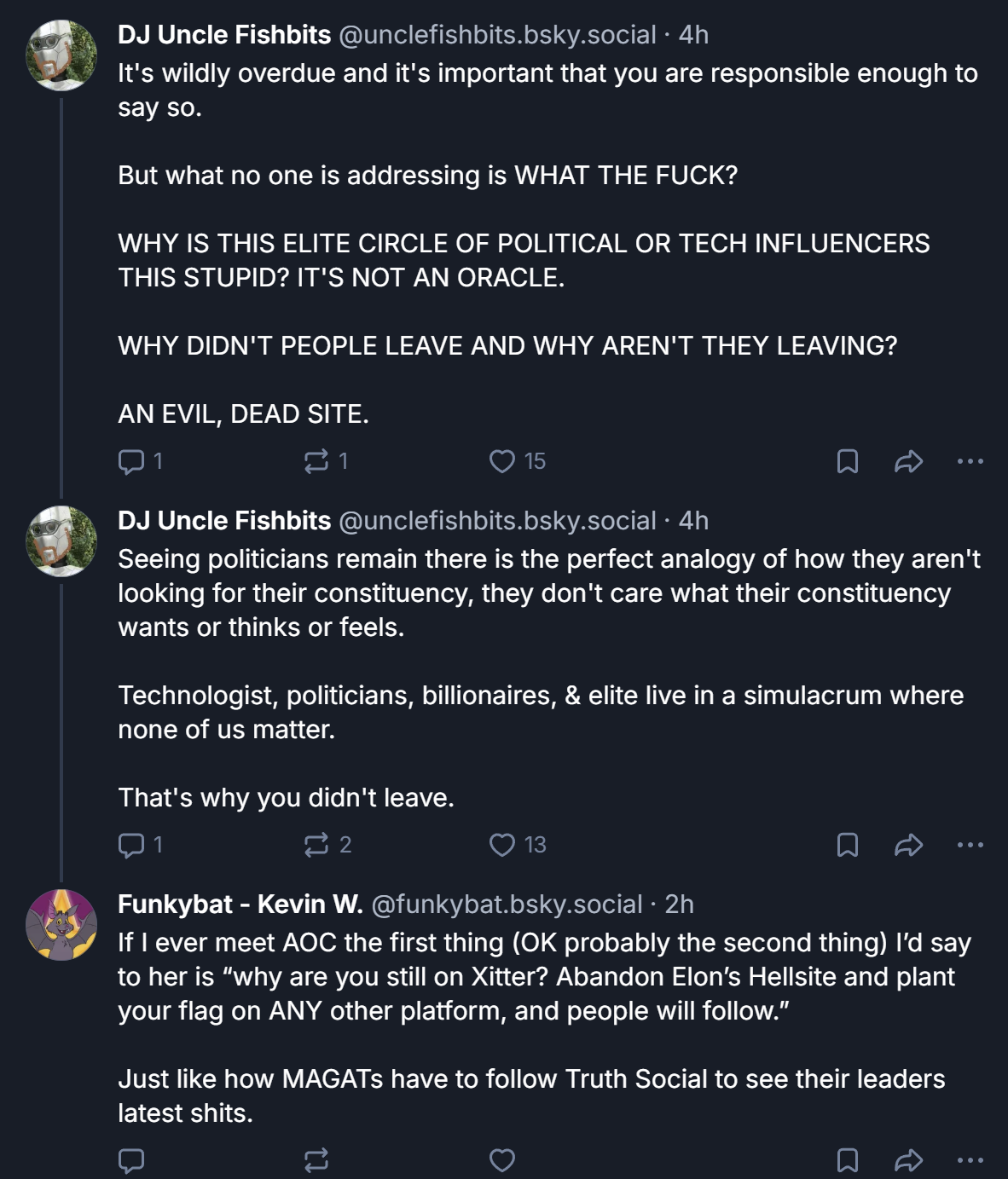 The bluesky comments are funny. Everyone's like "It's frankly immoral that you were on there at all for the last 3 years! All the decent people left long ago!"