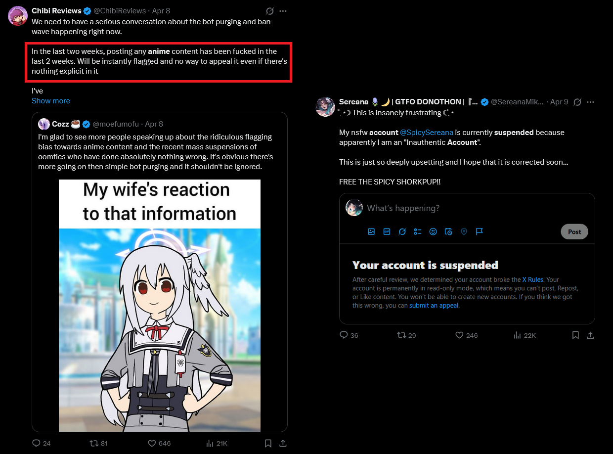 X is now censoring any anime images that show suggestive content doesn’t have to be NSFW, just things like exposed skin, belly, or thighs.During the purge, thousands of accounts sharing suggestive anime content were deleted. (Like i said, pantyshots, etc, not even hentai)Pic related I saw it happen live: 10 minutes ago, images were visible; 10 minutes later after I refreshed the page, they were flagged as offensive.This does not affect cosplayers, real women, OF etcMakes me wonder why