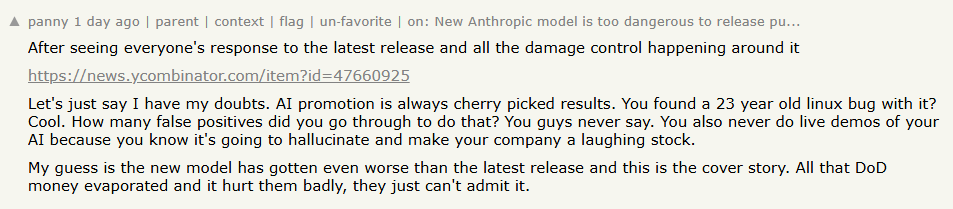 >>108581563>Why do slopussissies want Mythos so bad?Nobody wants it? Its the cybersec-only model, not a general one, retard