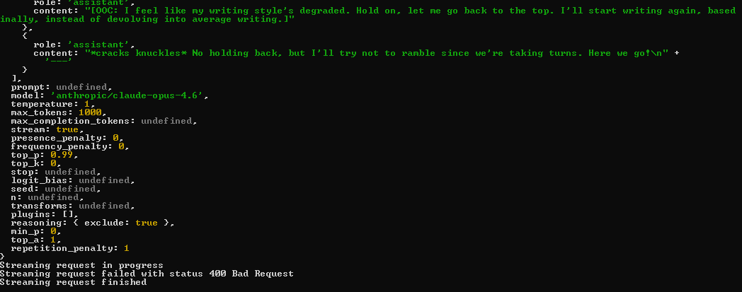 >>108575090Nothing much. Searching the error on github returned nothing. Looking at the logs it seems like only 8 tokens are even sent over. The actual sillytavern console returns nothing. Just an UI message at the top that the provider returned an error. For the record I'm not completely retarded and trying to use it off a proxy where it isn't available. This is off Openrouter. It's definitely available and I can ping it just fine with Test Message. >>108574921I'll cut you a deal. Give me the spoon and I'll post a really cool picture of my tortoise Scrubs.