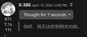 >>108582026the best joke is he didnt even leave the model tag enabled, because he knows hes lying.This could be gemini, but its not his logs anyways, its stitched together /vg/ logs his trying to pass as his own.