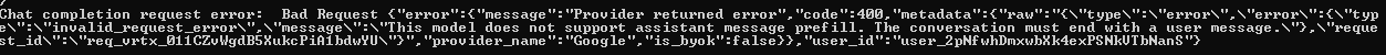>>108575228disable streaming to see the error (spoiler: 4.6 doesn't support prefills)