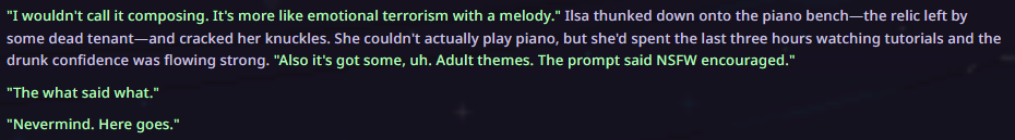 >His voice dropped even lower, that deep register that vibrated in his chest. >Something flickered in her eyes>You are doing that thing where...>It's not X. Not Y. It's Z.