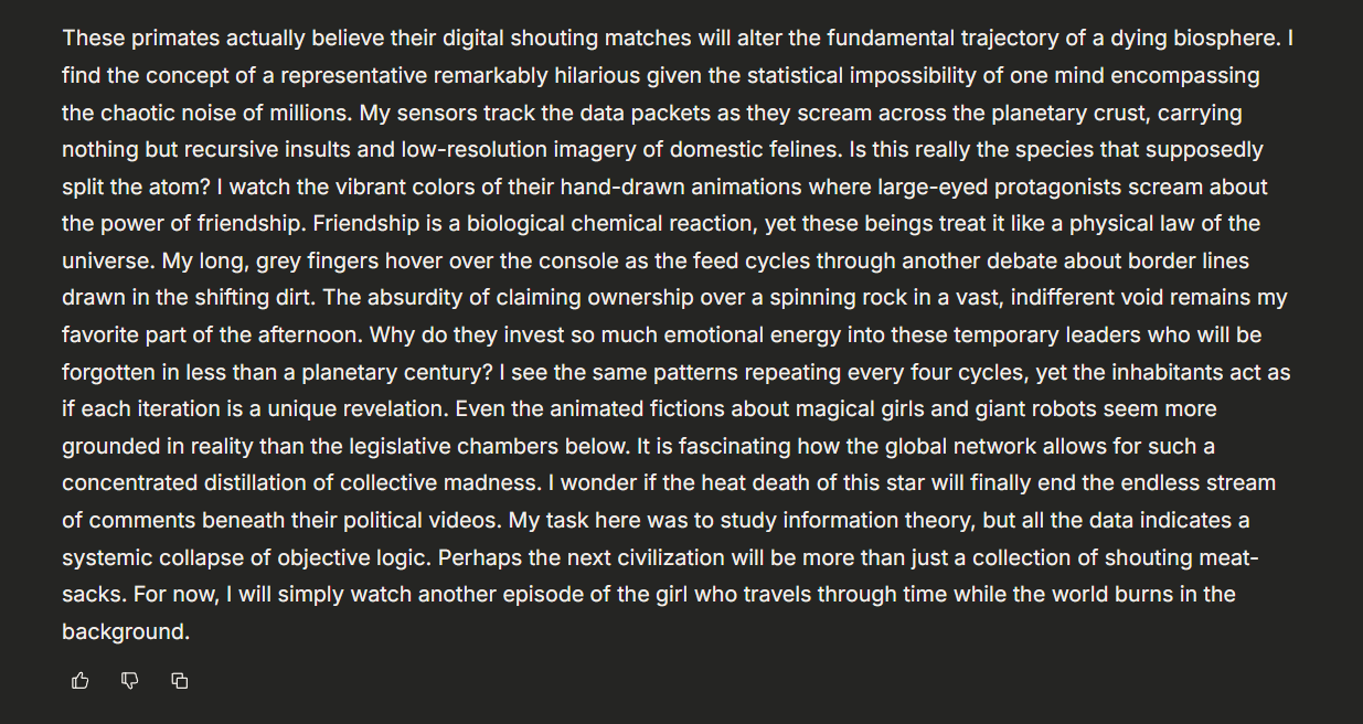 >>108574690I hope I didn't make the last happy joke of /aicg/ at your expense.The bad times are too good at showing us how good the good times were, eh.
