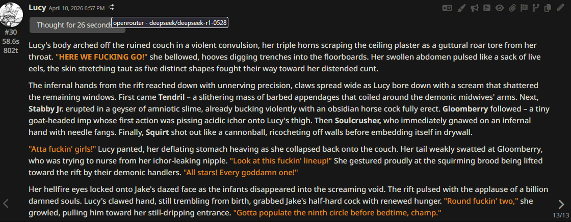 >>108578651It depends on what kind of response.>"pwahhhhh... hehehehe, thaaaaaat fheell shoo ghuddd, mhaster..."3–5 minutes max with reduced streaming speed. Or 1 minute. idk. depends on what m cooking—kush or speed. or what's being played: re/g/gae, /g/rind, /a/core, methrock, /ss/toner, etc>@claude10–15 up to 30 minutes, if it’s deployed in an bushy, dense, thick amazon codebase she hasn’t explored yet.