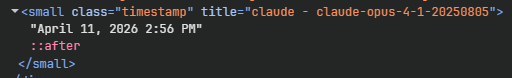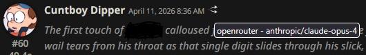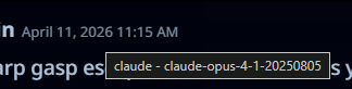 >>108582235>>108582245>>108582275>>108582317is this bait or do jeets actually not know that 1. you can hover over the timestamp to see the model name even if you have model icons disabled2. the tooltip style is browser/os dependent