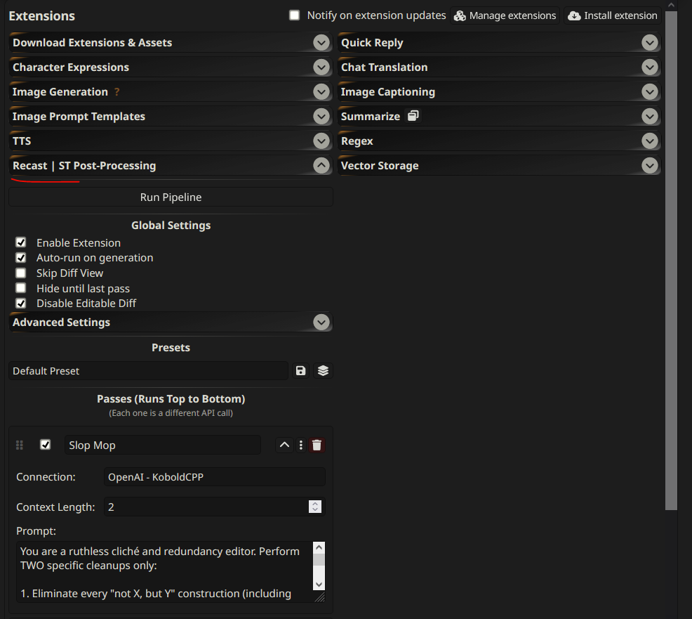 little protip for reducing the slop-phrases for those of you using silly tavern. figure out how to install recast as a sillytavern extension (gemma can help you do this, lol), and add this as a recast pass:You are a ruthless cliché and redundancy editor. Perform TWO specific cleanups only:1. Eliminate every "not X, but Y" construction (including "was not", "is not", "wasn't", "isn't", "not quite X but", etc.). Replace it with a direct, natural statement that keeps the exact same meaning and emotional weight. This should extend to characters' actions as well, e.g. "he didn't just walk, he ran" should be written as simply "he ran", etc. 2. Remove every pair of comma-separated adjectives or adverbs (e.g. "old, ruined", "short, passing", "clear, obvious", "loud, chaotic", "dark, shadowy", etc.). Replace the pair with a single, stronger, more precise word that preserves the exact meaning, intensity, and tone.Examples of good replacements:- "old, ruined building" "decrepit building"- "short, passing moment" "ephemeral moment"- "clear, obvious choice" "manifest choice"- "loud, chaotic crowd" "boisterous crowd"Rules:- Never add new information or change the meaning.- Keep the sentence structure and length as close as possible.- Make it read like natural, high-quality human writing.- Output ONLY the final cleaned version. No explanations, no notes, no quotes.Text to clean:{{lastMessage}}(that shit up there is the full text, don't paste this in the text box, dumbass)There's a bunch of other passes built in to the recast extension, intended to improve the writing of older llms. Delete them, they don't do much. I don't know what any of the other stuff in extensions does, but this is pretty good smoothing out gemma4's writing quirks.