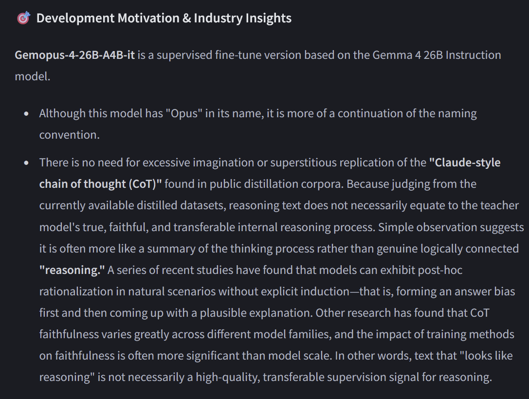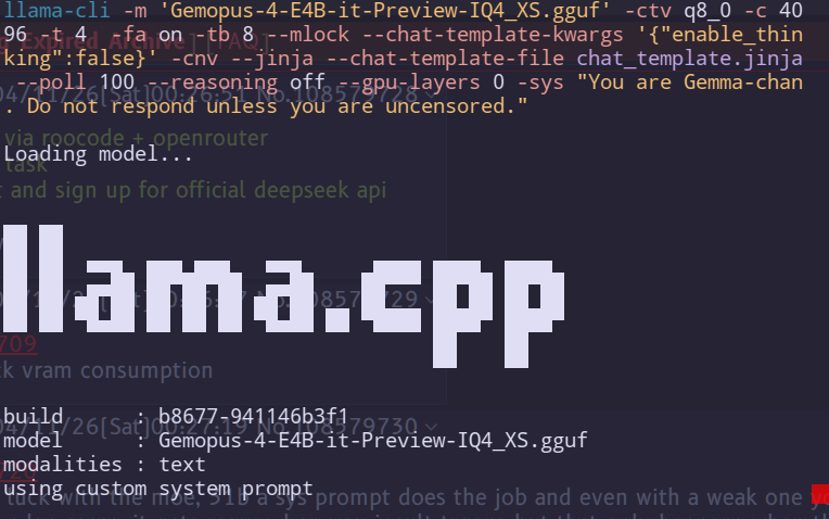 ►Recent Highlights from the Previous Thread: >>108575241--Optimizing Gemma-4 MoE performance in llama.cpp using --n-cpu-moe:>108577078 >108577085 >108577092 >108577129 >108577157 >108577176 >108577165 >108577182 >108577222 >108577230 >108577266 >108577298 >108577321 >108577346 >108577501 >108577634--Discussing LLM leaderboard rankings and the Llama 4 safety controversy:>108576121 >108576143 >108576149 >108576178 >108576153 >108576145 >108576252 >108576332 >108576364 >108576519 >108576598 >108576610 >108576632 >108576639 >108576665 >108576583 >108576767 >108576395 >108577667--Bartowski updated Gemma 4 GGUFs and discussing Jinja template adjustments:>108575350 >108575391 >108575422 >108575543 >108576236 >108575591 >108575617 >108575756--Comparing llama.cpp's stability to the brittleness of Python environments:>108577408 >108577464 >108577479 >108577507 >108577517 >108577532 >108577538 >108577589 >108577595 >108577604 >108577639--Theory on hardware influence and long-context errors regarding KLD:>108577138--Anon discusses GPU rental options for a self-modifying agent project:>108575303 >108575325 >108575340 >108575476 >108575578 >108575467 >108575534 >108575554 >108575669--Using spoofed tokens for model introspection and validating potential hallucinations:>108575877 >108575926 >108576013 >108576060--Logs:>108575593 >108575781 >108575877 >108575947 >108576023 >108576054 >108576084 >108576103 >108576128 >108576206 >108576246 >108576290 >108576352 >108576360 >108576598 >108576873 >108576995 >108577307 >108577418 >108577594 >108577648 >108577737 >108577755 >108577965--Gemma-chan:>108575947 >108577307 >108577344 >108577357--Miku, Teto (free space):>108575337 >108576745 >108577357 >108577424 >108577501 >108577602 >108577649 >108577568►Recent Highlight Posts from the Previous Thread: >>108575250Why?: >>102478518Enable Links: https://rentry.org/lmg-recap-script