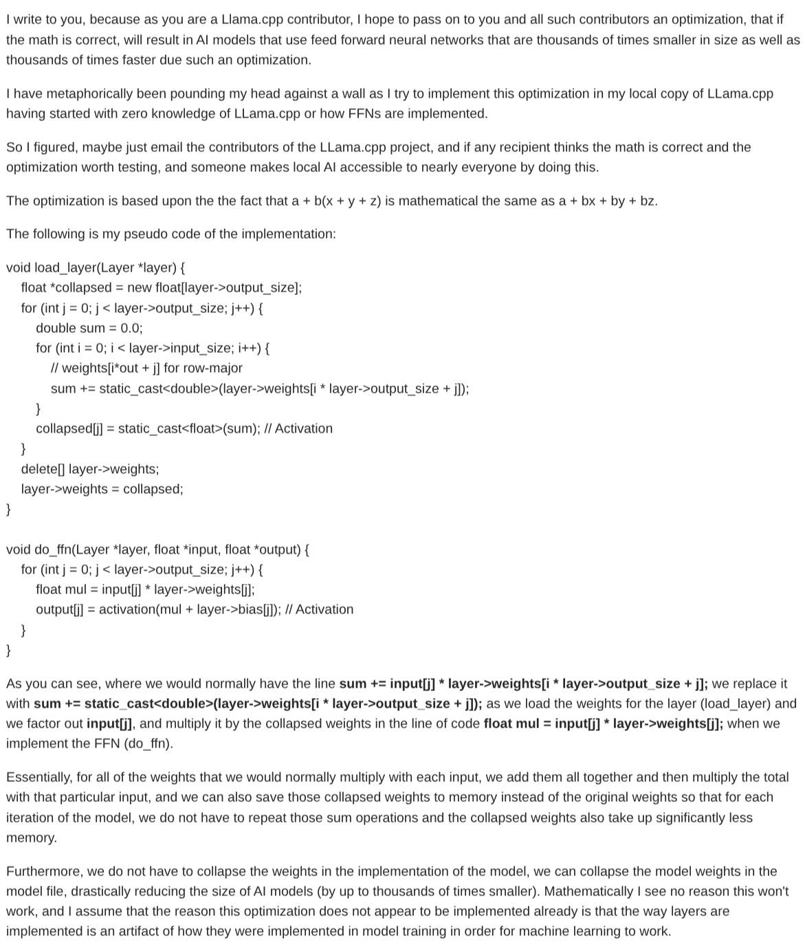 >>108580589Useless schizo rambling. But also as a fun fact:>a + b(x + y + z) != a + bx + by + bz because lol floating point math. FP math isn't actually associative.I'm not convinced the former actually offers any cycle savings either because the latter will just get turned into three fused multiply-adds by the compiler and vectorized.