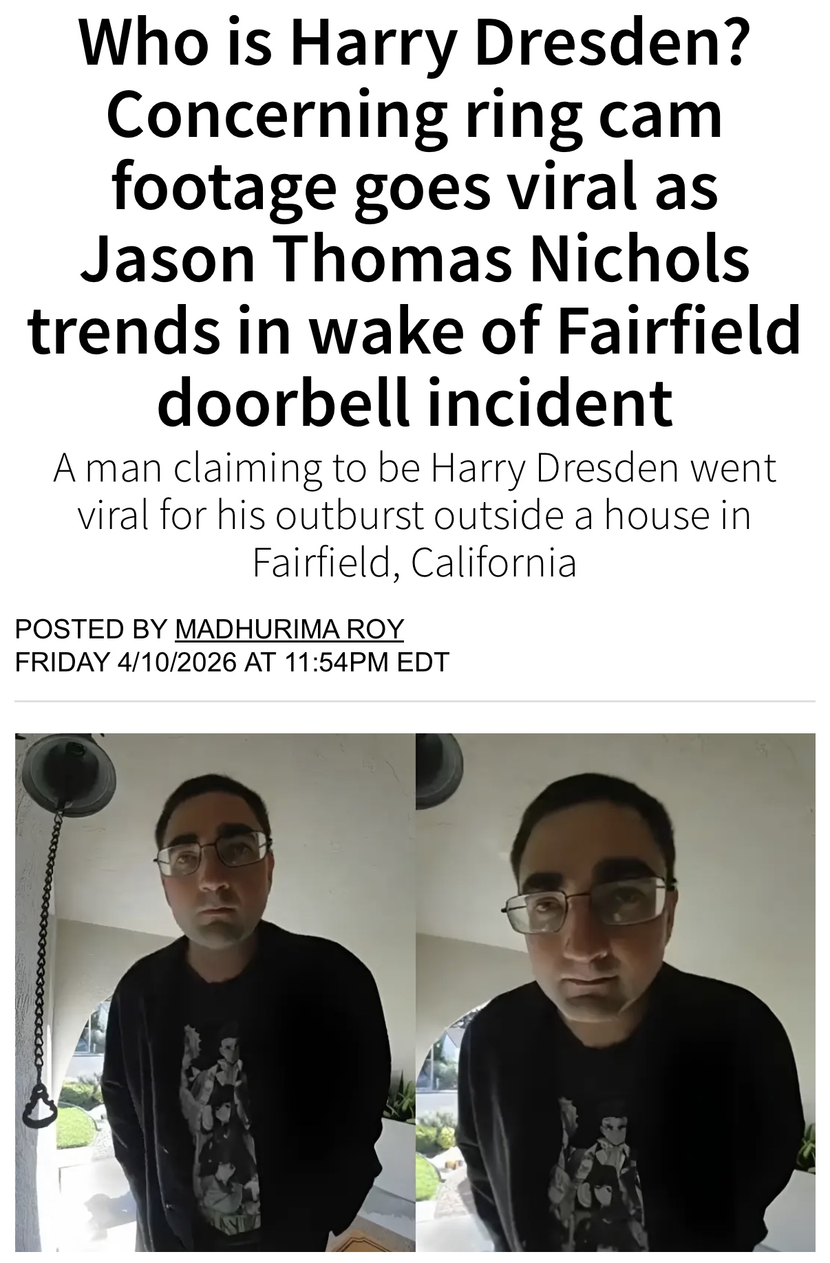 I don't know where Fairfield is, I have never been to California, I don't know anybody called Harry Dresden or James Nicholson Thomas. But after seeing this article I am now supposed to occupy my brain with "The Fairfield Doorbell Incident"