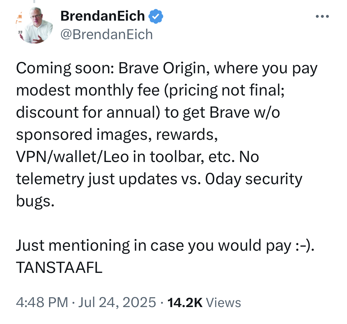 brave is everything firefox would have been, brendan mistake was to bring MBAs to leadership, a good mba graduate is a dead mba graduate, these subhumans ruin absolutely everything they touch.