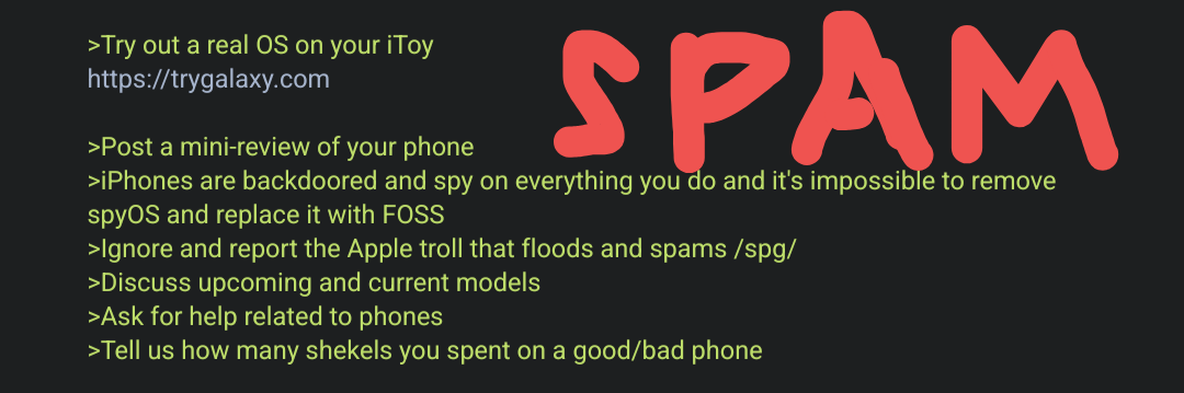 >What phone has X and Y feature?Don't ask, use these!https://www.gsmarena.com/search.php3https://www.kimovil.com/en/compare-smartphoneshttps://phonedb.net/index.php?m=device&s=queryGood Resources:>Reviewshttps://www.gsmarena.comhttps://www.phonearena.comhttps://www.notebookcheck.net>Frequency Checkershttps://www.frequencycheck.comhttps://kimovil.com/en/frequency-checkerhttps://willmyphonework.net>Visual Phone Size Comparisonhttps://phonesized.com/https://www.phonearena.com/phones/size>Everything rooting and custom ROM related>Beware carrier variants with locked bootloadershttps://www.xda-developers.com/>Debloat your stock ROMhttps://github.com/Universal-Debloater-Alliance/universal-android-debloater-next-generation>Open source Android applicationshttps://f-droid.org/>Android App compatibility list for de-googled phoneshttps://plexus.techlore.tech/>Custom ROMs suggestions, privacy guideshttps://gearjail.neocities.org/>Recommended phoneshttps://www.gsmarena.com/smartphone_buyers_guide-review-2036.php>Try out a real OS on your iToyhttps://trygalaxy.com>Post a mini-review of your phone>iPhones are backdoored and spy on everything you do and it's impossible to remove spyOS and replace it with FOSS>Ignore and report the Apple troll that floods and spams /spg/>Discuss upcoming and current models>Ask for help related to phones>Tell us how many shekels you spent on a good/bad phonePrevious thread: >>108551349