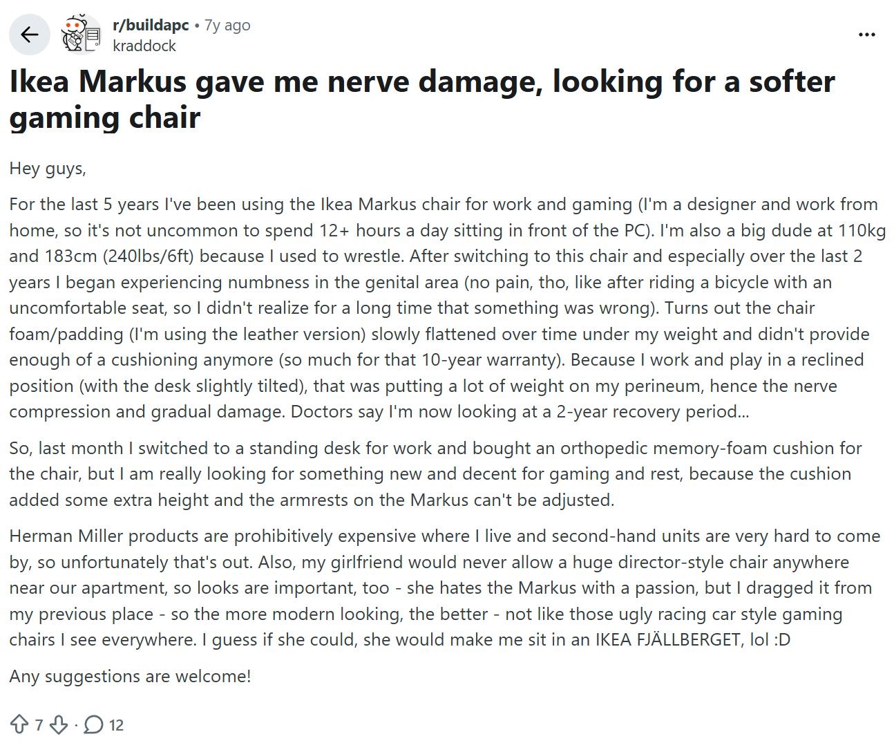 I was looking into buying a new chair after my OfficeMax chair fell apart. I almost fell for the Gaymer chair shit, but my autism told me that sitting in a bucket seat for prolonged periods of time was retarded. I almost fell for the Ikea meme as well, but luckily the Markus was out of stock.
