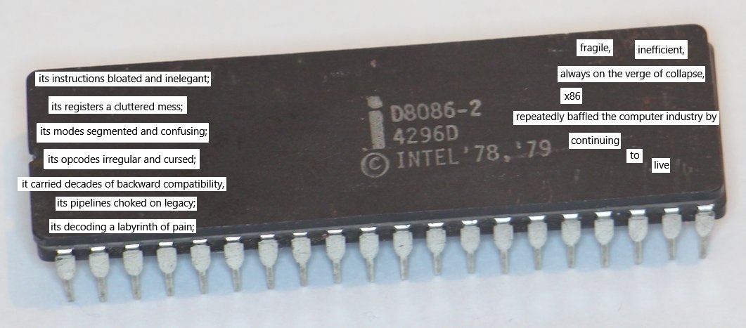 >>108590804The 286 was an improvement. The 386 was where it went wrong. AMD64 made it even worse. The 8086 and 286 actually had a lot of reasoning behind the design of everything, but people tried changing it into different things like adding SIMD and making it more RISC-like.