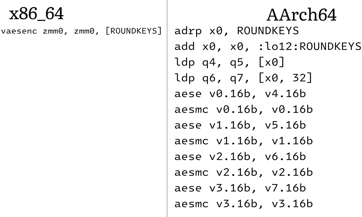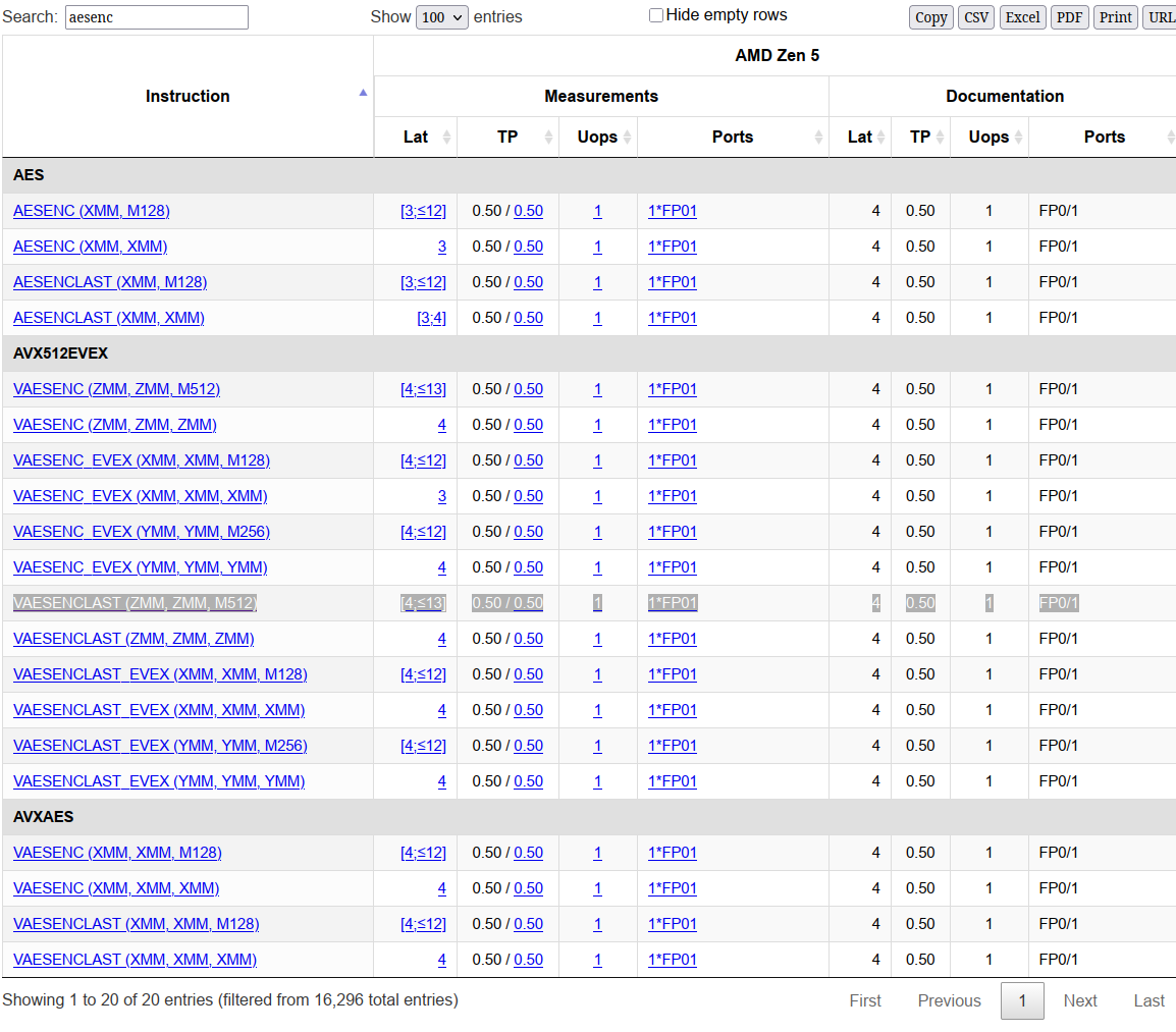 >>108590832>one 512-bit memory load (single operation)>one round of AES on each 128-bit chunk of zmm0 (single operation)Still going to insist ARM wins here?https://uops.info/table.html