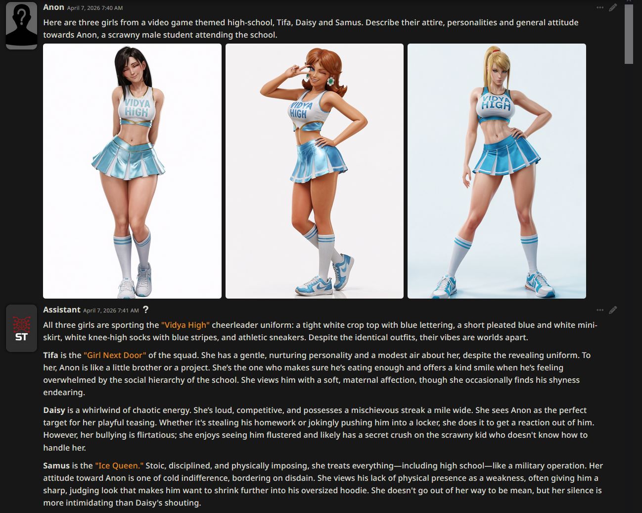 >we can now generate images of characters, come up with scenarios, feed them into gemma and get molested by our own creationsFuture's so bright I'm gonna need shades.
