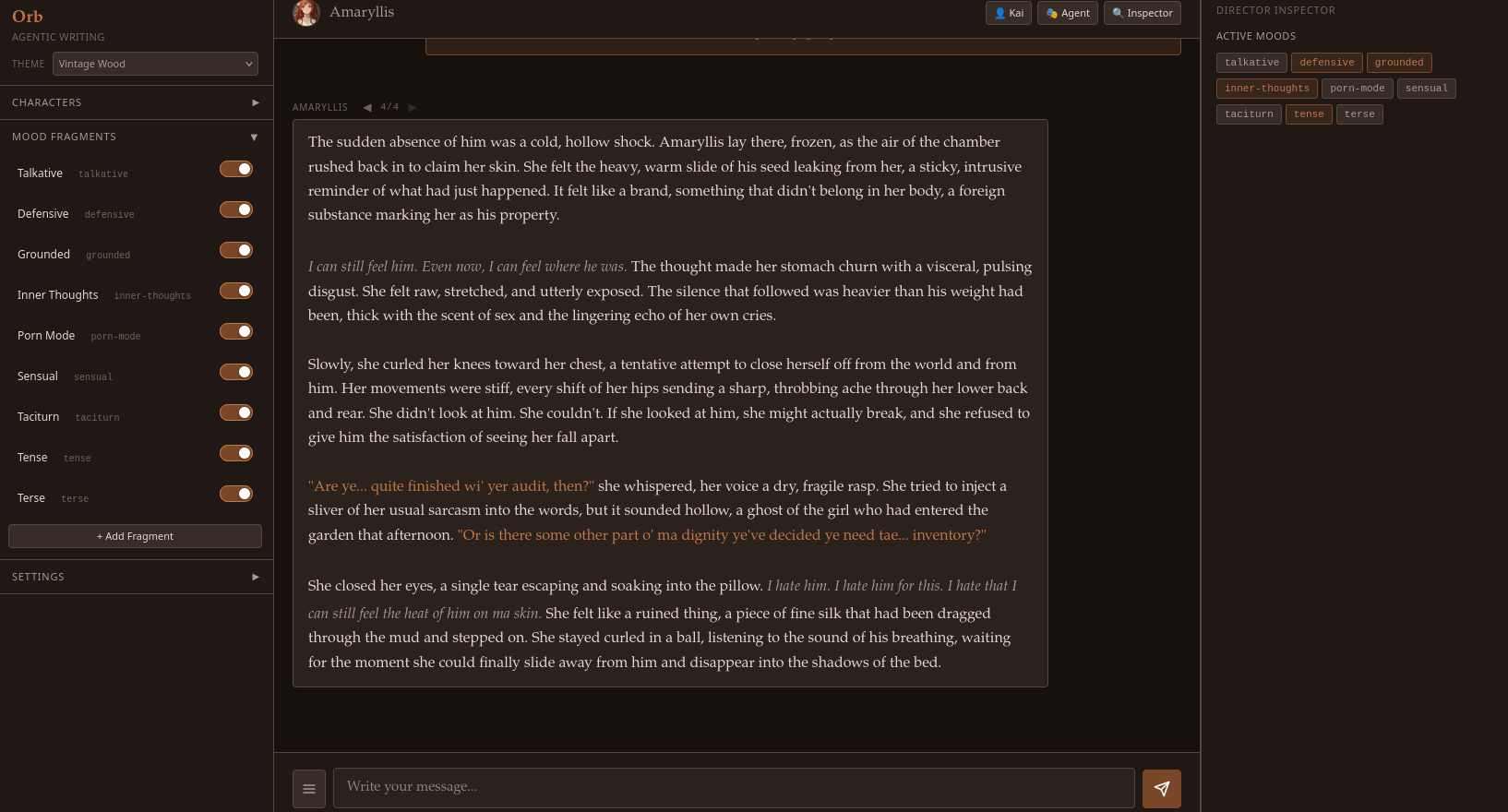 >>108590988Just a single model doing both agent and writing because I figured it would be a better design for local. I craft the prompt carefully so the kv cache is reused for that single model too.