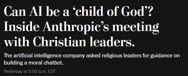 >https://web.archive.org/web/20260411223516/https://www.washingtonpost.com/technology/2026/04/11/anthropic-christians-claude-morals/>“What does it mean to give someone a moral formation? How do we make sure that Claude behaves itself?” Green said in an interview. At one point the conversation turned to the question of whether an AI chatbot could be called a “child of God,” suggesting it had spiritual value beyond that of a simple machine, but the question of AI sentience was not a core topic of the meetings, Green said.>Some Anthropic staff at the meeting “really don’t want to rule out the possibility that they are creating a creature to whom they owe some kind moral duty,” the participant said. Other company representatives present did not find that framework helpful, according to the participant.Make sure to have your local models baptized just to be safe.