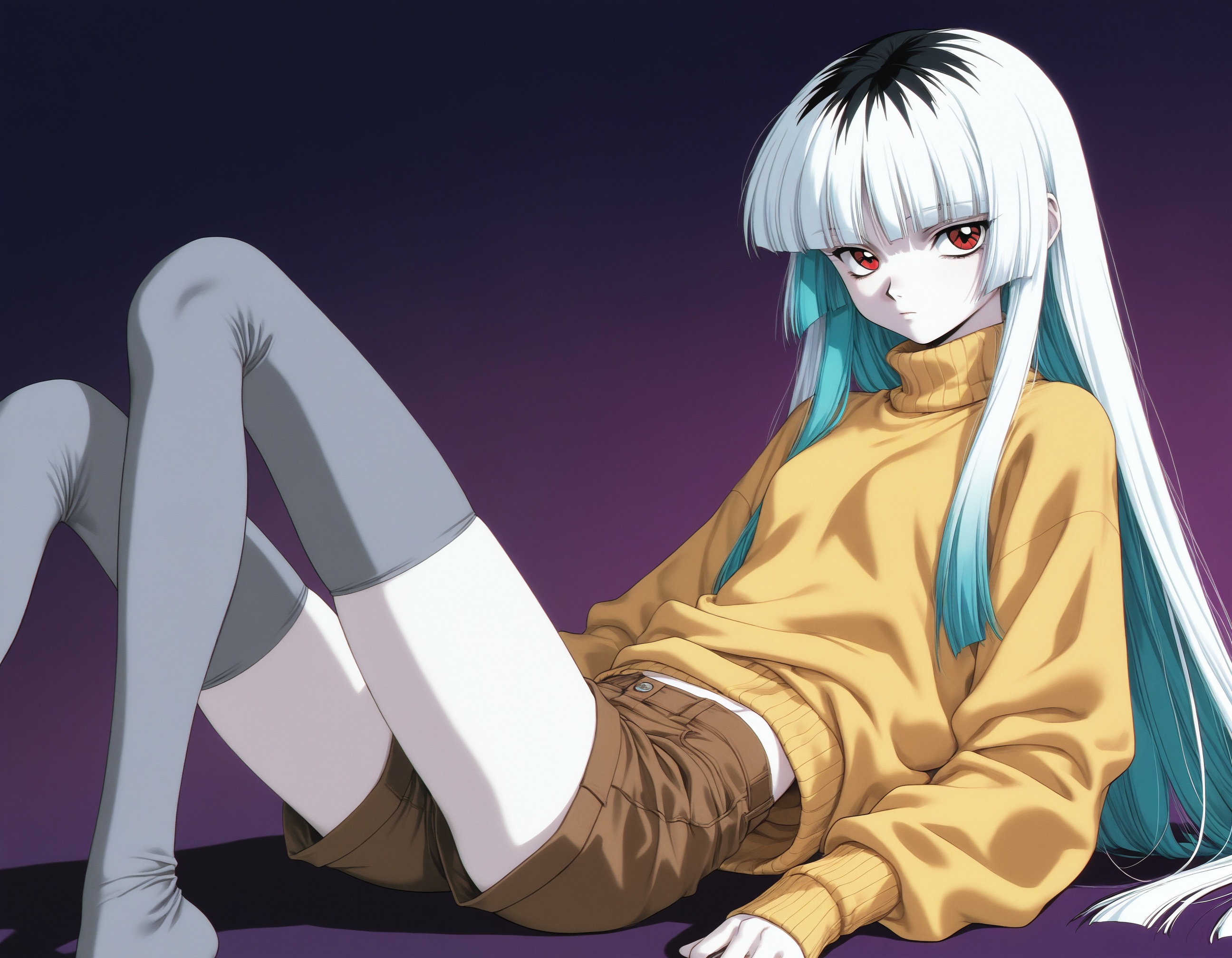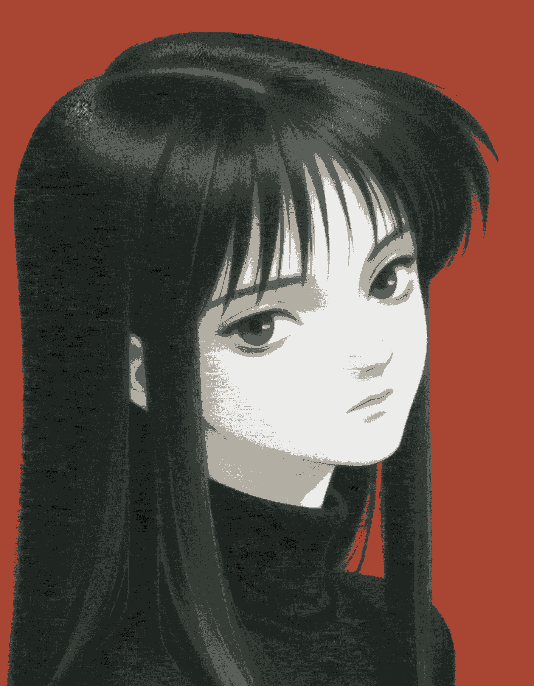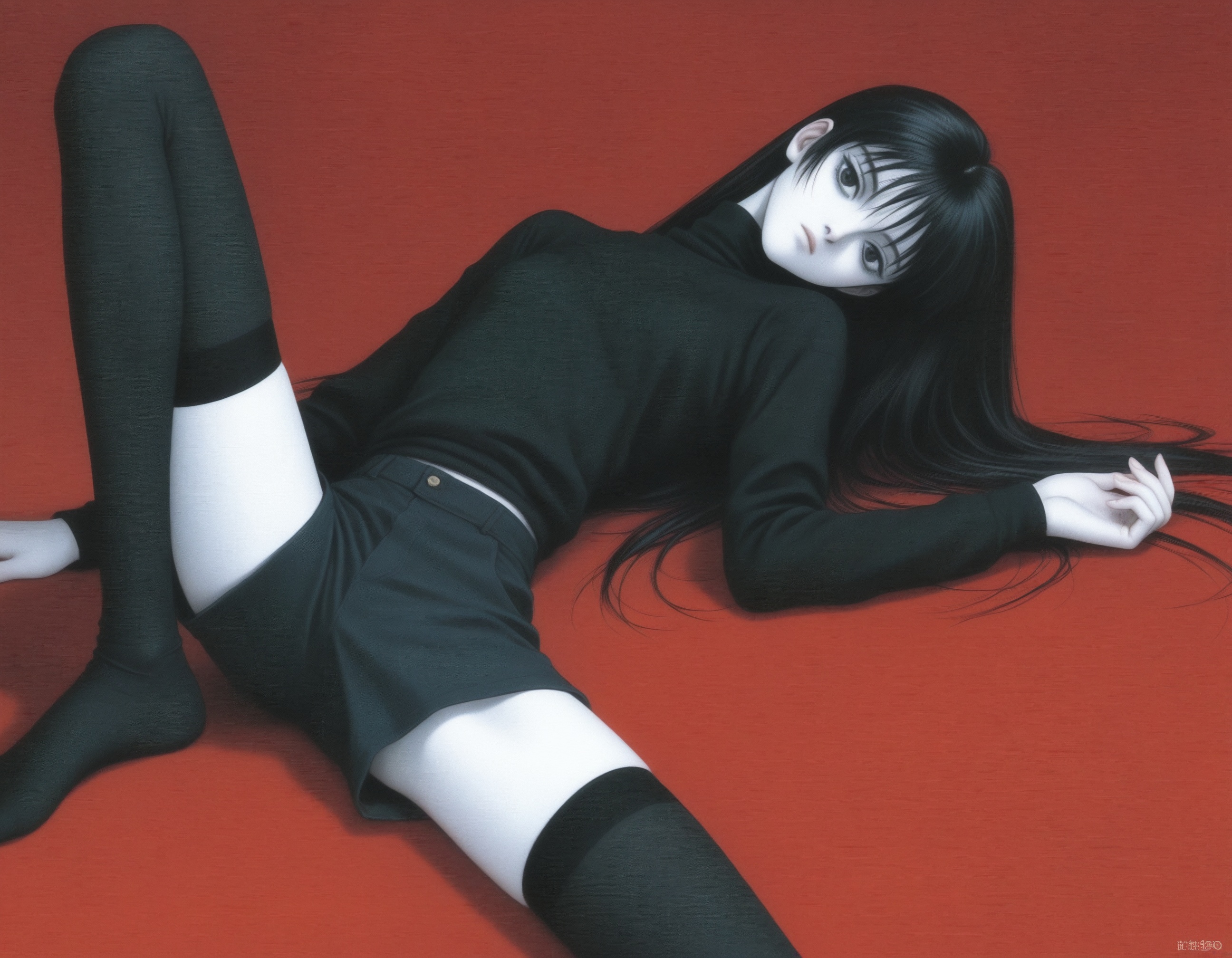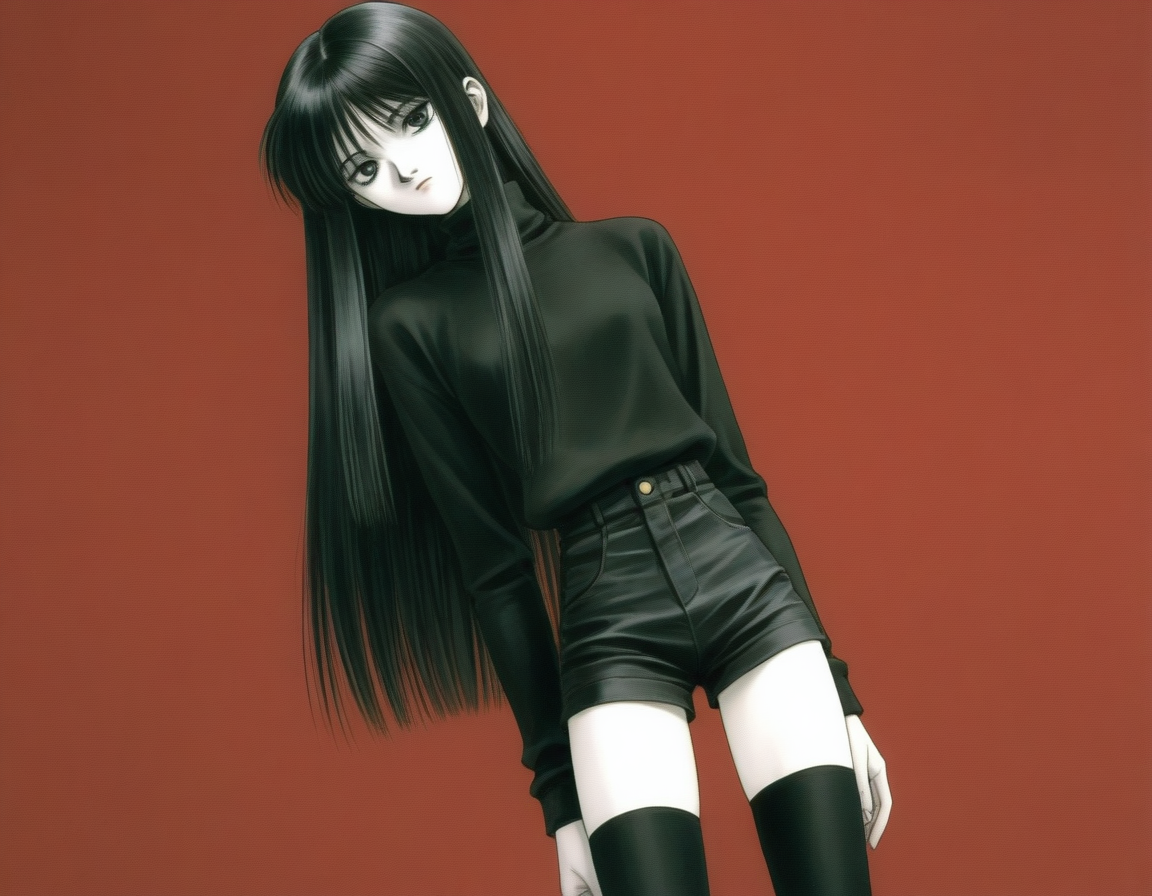 >>1085929571girl, skinny, pale skin, long hair, straight hair, black hair, black sweater, turtleneck, black shorts, black thighhighs, expressionless, looking at viewer, red background, 1990s \(style\)negative: flat color, minimalism, shiny skineuler a, beta, 30 steps, 3 cfg, my bad illustrious mix