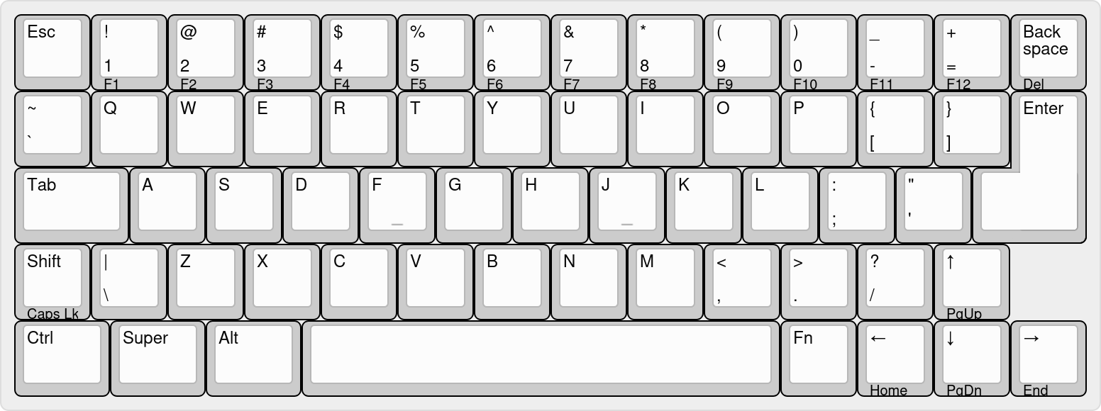 The perfect keyboard layout.https://www.keyboard-layout-editor.com/##@@=Esc&_a:0%3B&=!%0A1%0A%0A%0AF1&=%2F@%0A2%0A%0A%0AF2&=%23%0A3%0A%0A%0AF3&=$%0A4%0A%0A%0AF4&=%25%0A5%0A%0A%0AF5&=%5E%0A6%0A%0A%0AF6&=%2F&%0A7%0A%0A%0AF7&=*%0A8%0A%0A%0AF8&=(%0A9%0A%0A%0AF9&=)%0A0%0A%0A%0AF10&=%2F_%0A-%0A%0A%0AF11&=+%0A%2F=%0A%0A%0AF12&=Back%3Cbr%3Espace%0A%0A%0A%0ADel%3B&@_a:4%3B&=~%0A%60&=Q&=W&=E&=R&=T&=Y&=U&=I&=O&=P&=%7B%0A%5B&=%7D%0A%5D&_h:2&w2:1.5&h2:1&x2:-0.5&y2:1%3B&=Enter%3B&@_w:1.5%3B&=Tab&=A&=S&=D&_n:true%3B&=F&=G&=H&_n:true%3B&=J&=K&=L&=%2F:%0A%2F%3B&=%22%0A'%3B&@_a:0%3B&=Shift%0A%0A%0A%0ACaps%20Lk&_a:4%3B&=%7C%0A%5C&=Z&=X&=C&=V&=B&=N&=M&=%3C%0A,&=%3E%0A.&=%3F%0A%2F%2F&_a:0%3B&=%E2%86%91%0A%0A%0A%0APgUp%3B&@_a:4&w:1.25%3B&=Ctrl&_w:1.25%3B&=Super&_w:1.25%3B&=Alt&_a:7&w:6.25%3B&=&_a:4%3B&=Fn&_a:0%3B&=%E2%86%90%0A%0A%0A%0AHome&=%E2%86%93%0A%0A%0A%0APgDn&=%E2%86%92%0A%0A%0A%0AEnd