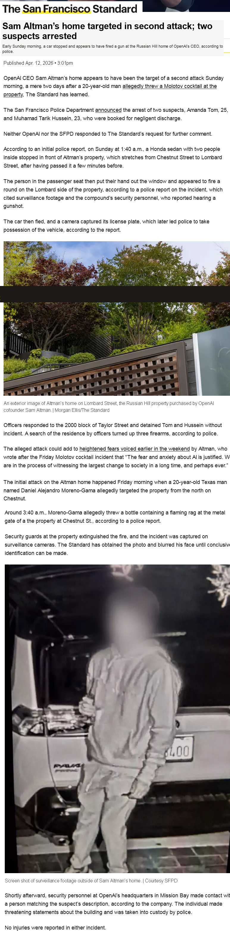 HONDA DRIVING SHOOTERS ARRESTED according to the SF Standard. Which blocks out the CCTV face of the Molotov attacker for privacy, but helpfully provides Sams address and photo of the outside of his house for anyone else wanting a go. Wouldn't want anyone shooting at the wrong house or anything.