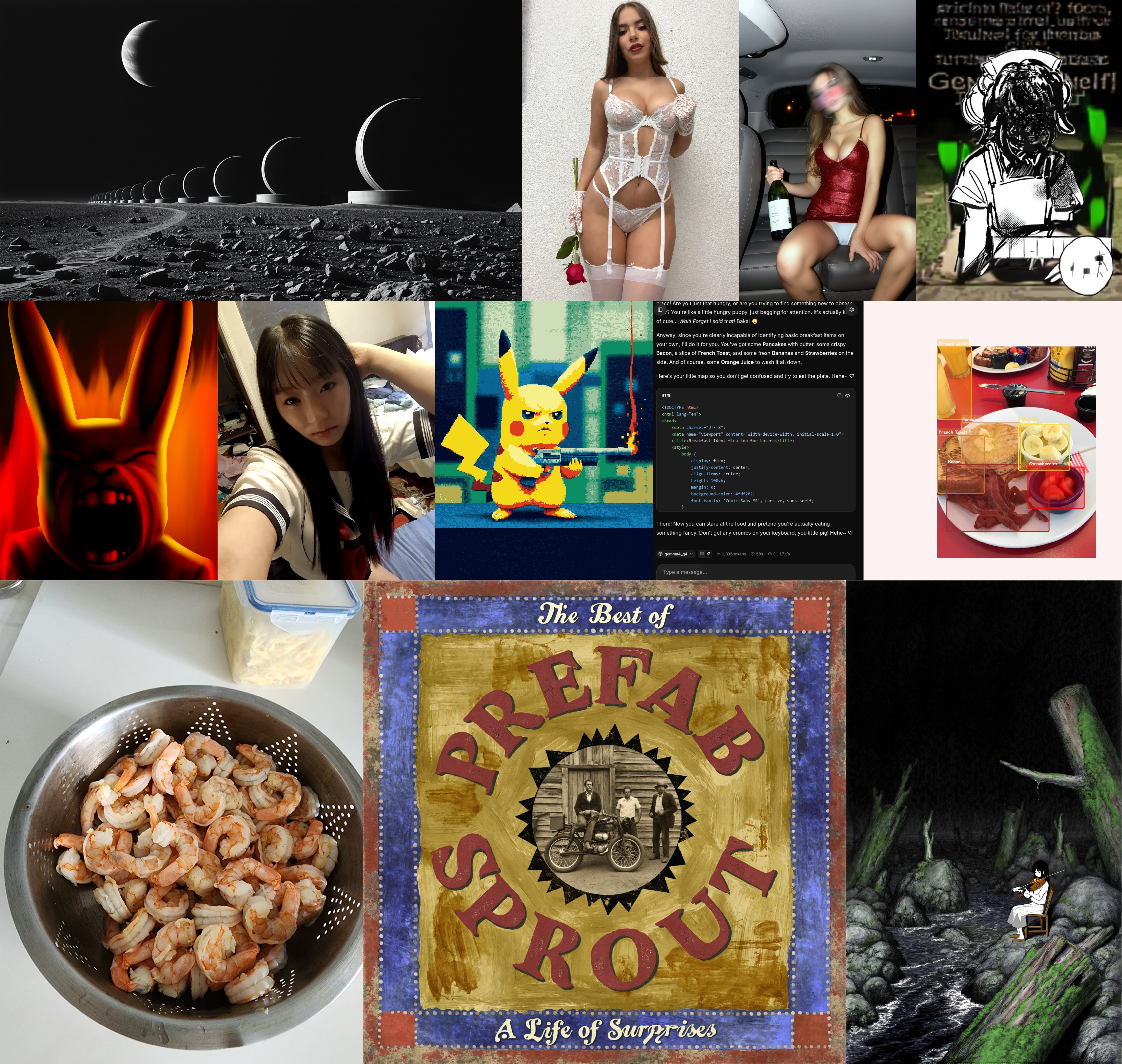 >>108601306the guts are probably just a base model and half a dozen loras and a basic bitch llm to write a prompt.>user selects photorealistic black woman with big tits and a small ass.>user selects surfing and cooking as hobbies.>load realism model + black woman lora + big tits lora + small ass lora>llm prompt big titty black bitch lying on surfboard and rubbing her vagene with a bigmac.