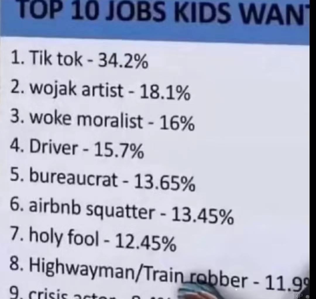 >>108608528>become a tradiesuch a fucking meme. you know bill gates goes around telling people this shit but none of his own kids are in the trades? you know why? because the advice is to get working class people the fuck out of white collar jobs. the elites want them out because if you grew up in the suburbans and not a country club, then you're more likely to fight back against schemes like say "let's poison the water supply and have our retarded AI chatbots sell shit things to shit cunts 5% more efficiently". so what do you do? you pull the ladder up. you decimate the pathway for the working class to gain white collar employment, keep them as tradies or whatever, and don't give them the mental framework required to make any real systematic change to their societies they live in. pretty good fuckin' move ngl.