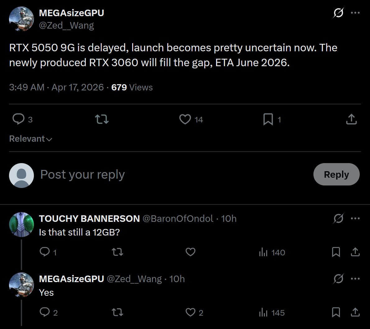 >>108620118>>108620096What I should have said was:Unless you own the graphics card, you're just speculating, you have no empirical evidence.
