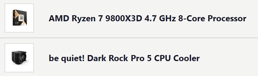 >UPGRADE & BUILD ADVICEPost build list or current specs: https://pcpartpicker.com/Provide specific use casesState BUDGET and COUNTRY or you will NOT be helped>CASEmATX: AP201, Lian Li A3, O11 Air Mini, XT M3, CH260ATX: XT PRO (ULTRA), AIR 903 Base/MAX, Lancool 207, Flux Pro, Meshify 3, 4000D FRAME, X50Dual Chamber: Y60/70, O11 Vision, Antec C8>CPUGaming: 250K, 14600k, 9/7600X, 7/9800X3D-Budget: 225F, 7500FWorkstation: 270K*Avoid Ascrock motherboards*New sockets likely next year*On Raptor Lake microcode updates are mandatory, avoid second-hand>COOLERAIO: Thermalright Frozen Edge, Lian Li Galahad II Lite, Corsair Nautilus RS, Cooler Master Atmos, Liquid Freezer 3/Pro (unhandy mounting solution)ITX/>42mm RAM: Mugen 6 Dual Fan, AXP120-X67TIM: MX-6, MX-4, Duronaut, *PTM 7950, Kryosheet*Most listings online are not actually 7950>RAMDDR5: 2x16GB or 2x24GB, 6000CL30 (AM5), 6400CL32 (LGA 1700) Workstation: 2x 32GB (budget.), 2x48GB or 2x64GB (high-end)>SSD (Keep firmware updated)Budget: SN7100, NM790High-end: SN850X, 990 Pro (Windows)Premium: SN8100https://borecraft.com/>GPUBudget: Arc B580, 9060xt, 5060-Used: 2080, 2080ti*8gb has become a major constraint even at 1080pMidrange: 5070, 9070-Used: 3080, 3080ti4k : 5070ti, 9070xt-Native/High-end: 5090>PSUBuying guide:https://hwbusters.com/best_picks/best-atxv3-pcie5-ready-psus-picks-hardware-busters/>MONITOR1440p: 27" 165/180hz IPS, KTC M27T6 (miniLED), ASUS XG27AQWMG (WOLED)4K: KTC M27P6 (miniLED)>OSActivate Windows @ >>>/g/fwt>CASE FANSMeta: Case with good stock PWM fansMidrange: Arctic P12 Pro, P14 Pro (5-pack, loud @ higher RPM)High-end: Fractal Momentum, Noctua G2 (140mm or 120mm)Previous : >>108601545