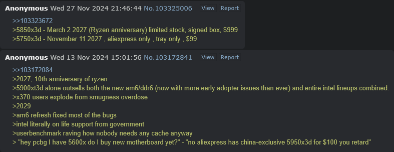 >5800X3D re-releasefree money for AMD. rent a cheap-ass back alley production line and shit out an old design and sell it to the cattle not rich enough to upgrade from AM4 due to RAM prices.
