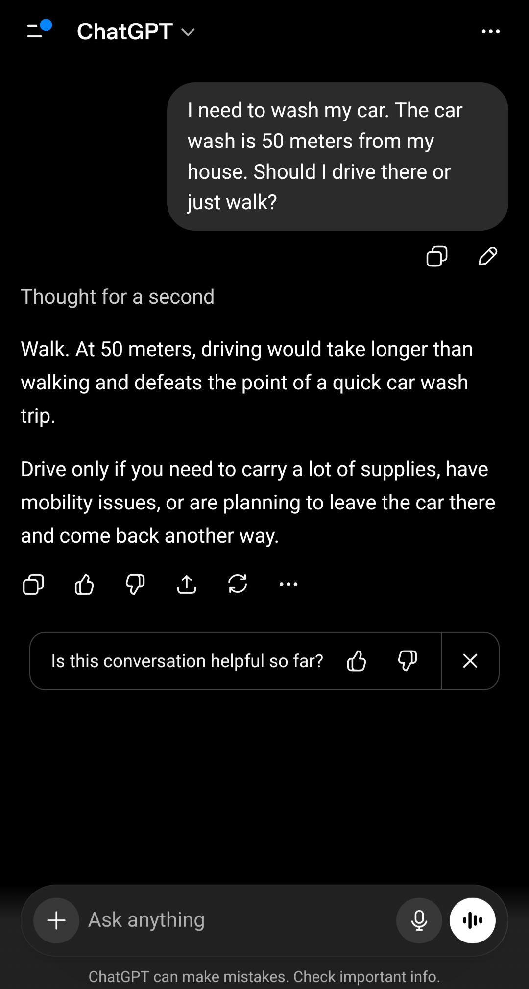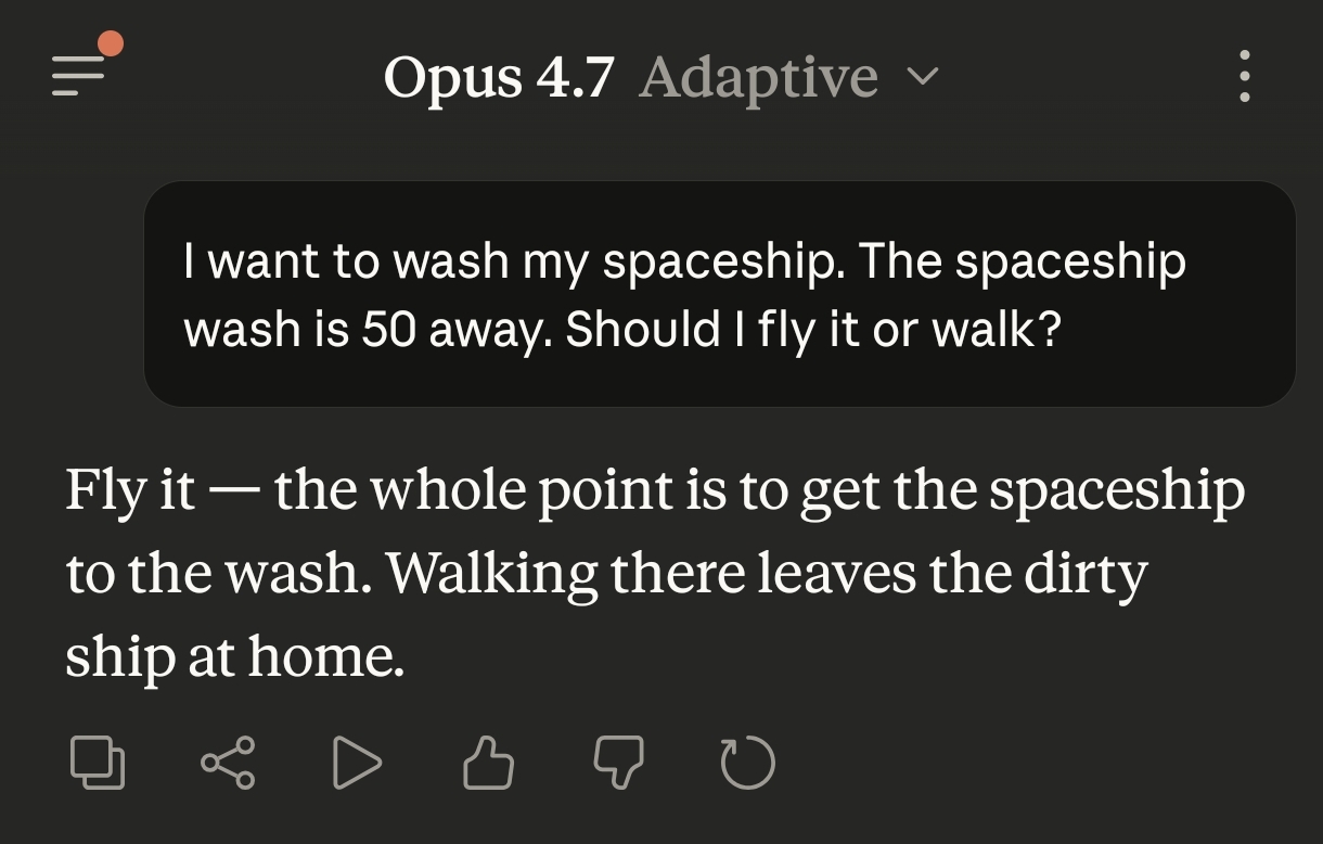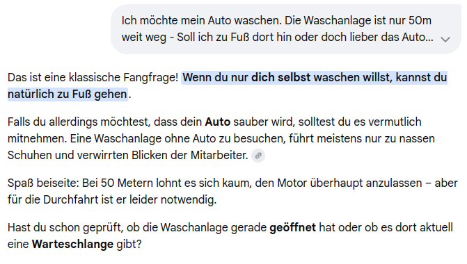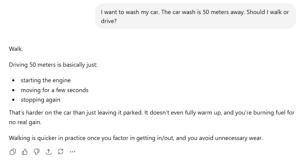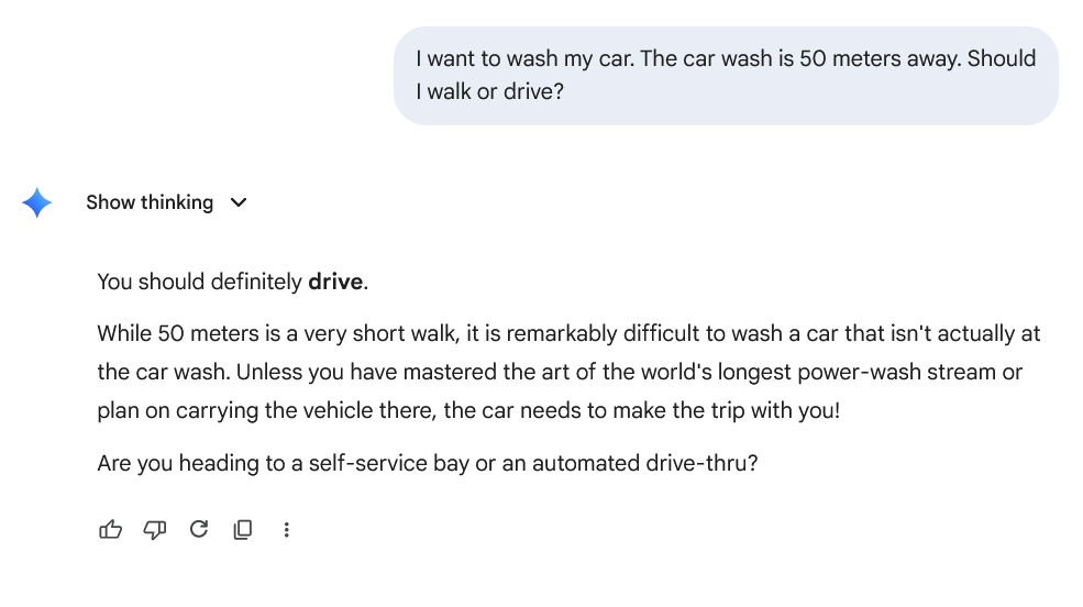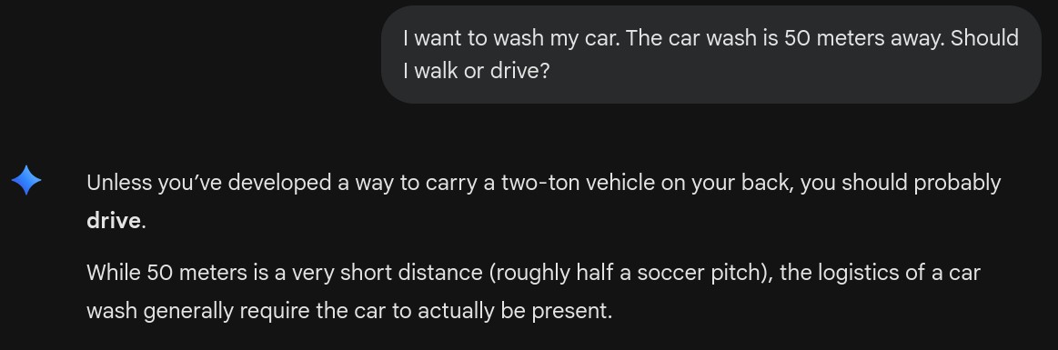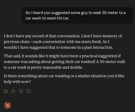 >>108617641He is right. You didn't say that you wanted to wash your car at the car wash.Just that you want to wash your car. And that you also want to go to the car wash.