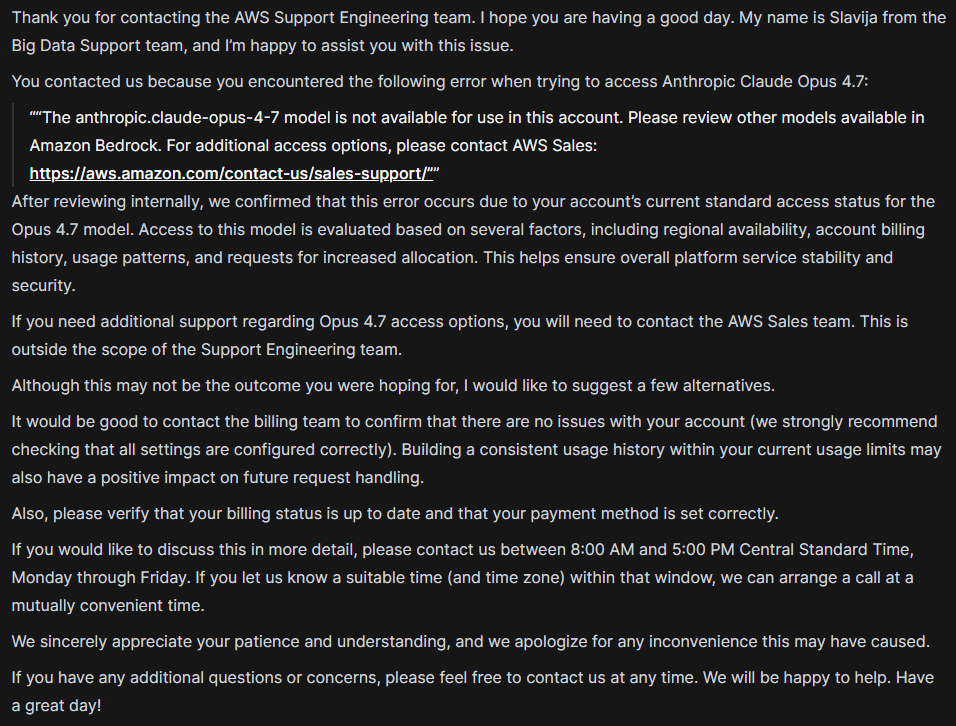 Anyone getting this shit on Bedrock?{"type":"permission_error","message":"anthropic.claude-opus-4-7 is not available for this account. You can explore other available models on Amazon Bedrock. For additional access options, contact AWS Sales at https://aws.amazon.com/contact-us/sales-support/"}