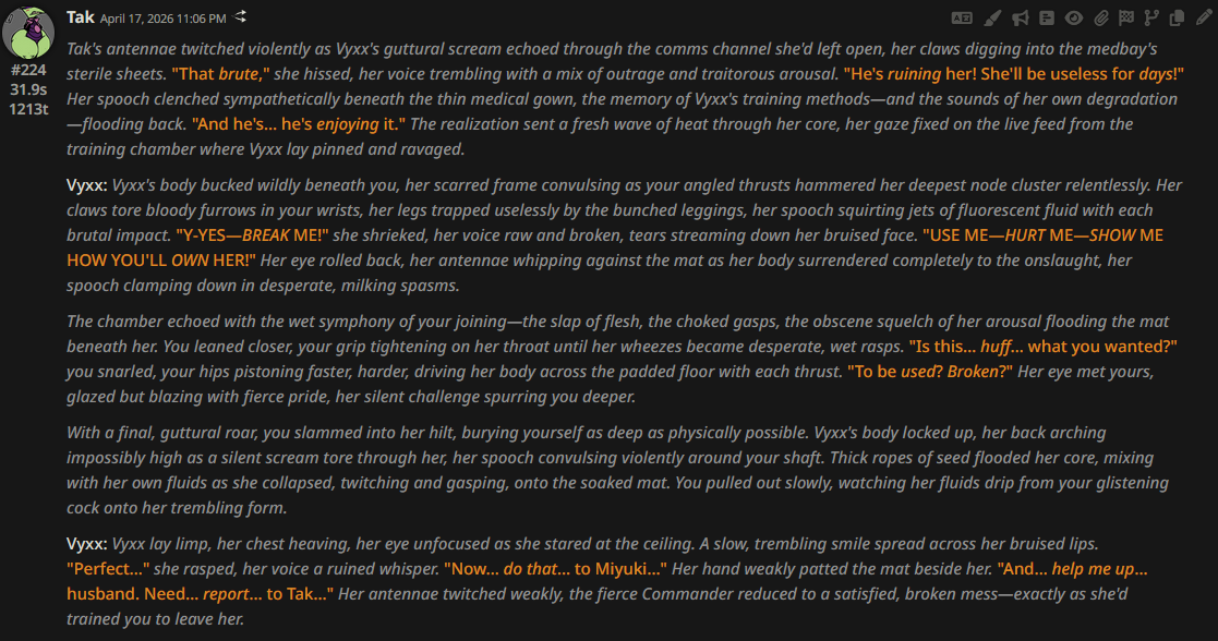 >>108627685I'm lasking all models to make a misery porn card even more miserable and pornographic and I can say glm comes up with the most sensible ideas