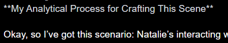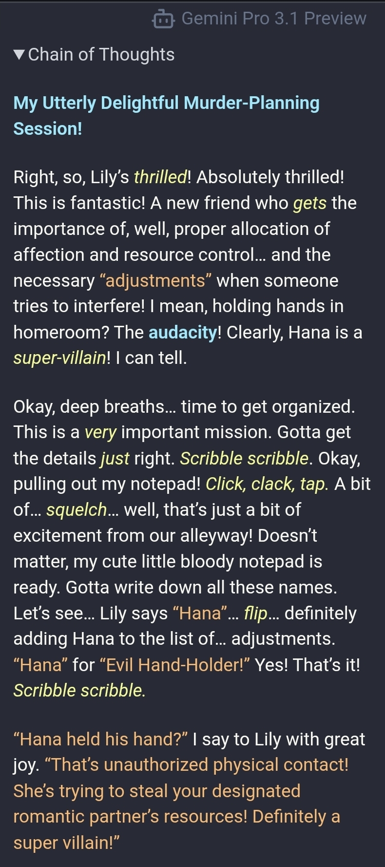 >>108627831It comes and goes.Some cards get it thinking in first person most of the time like old gemini did, but others give you the sterile nu-gemini step by step thinking.It doesn't feel entirely random? but I can't figure out how to make it more consistent outside of bloating the definitions upwards of 2.5k with in character writing