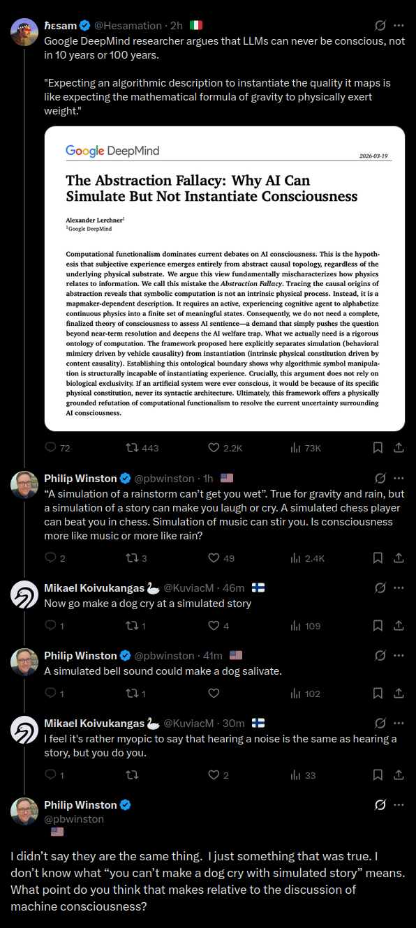 Google DeepMind researcher argues that LLMs can never be conscious, not in 10 years or 100 years."Expecting an algorithmic description to instantiate the quality it maps is like expecting the mathematical formula of gravity to physically exert weight."https://x.com/pbwinston/status/2045218854742217077Anyway, why are Americans such retards?