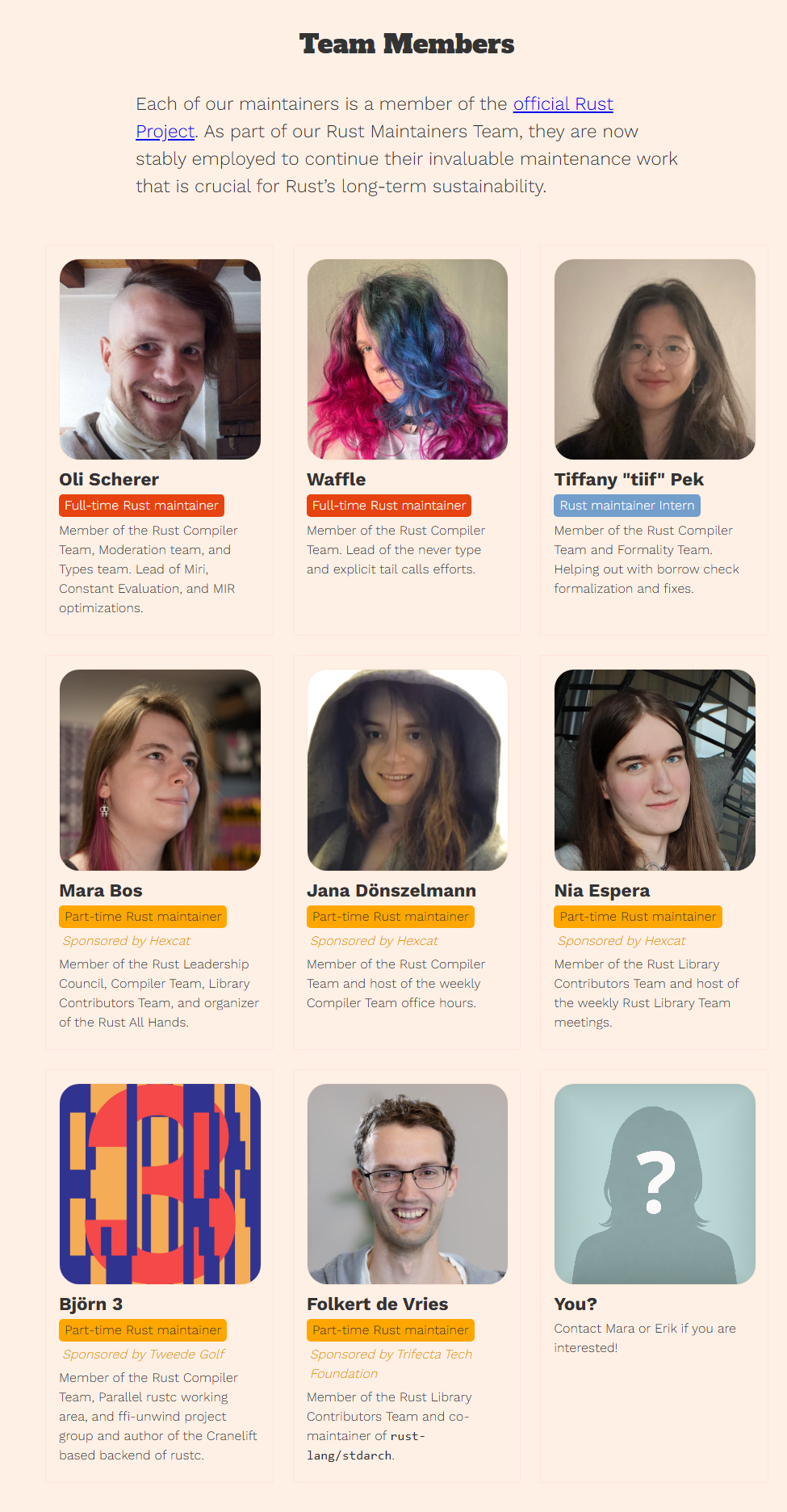 >>108626801>Meet the new Rust Maintainers teamWhy most of them aren't even listed on the official website?https://prev.rust-lang.org/en-US/team.html