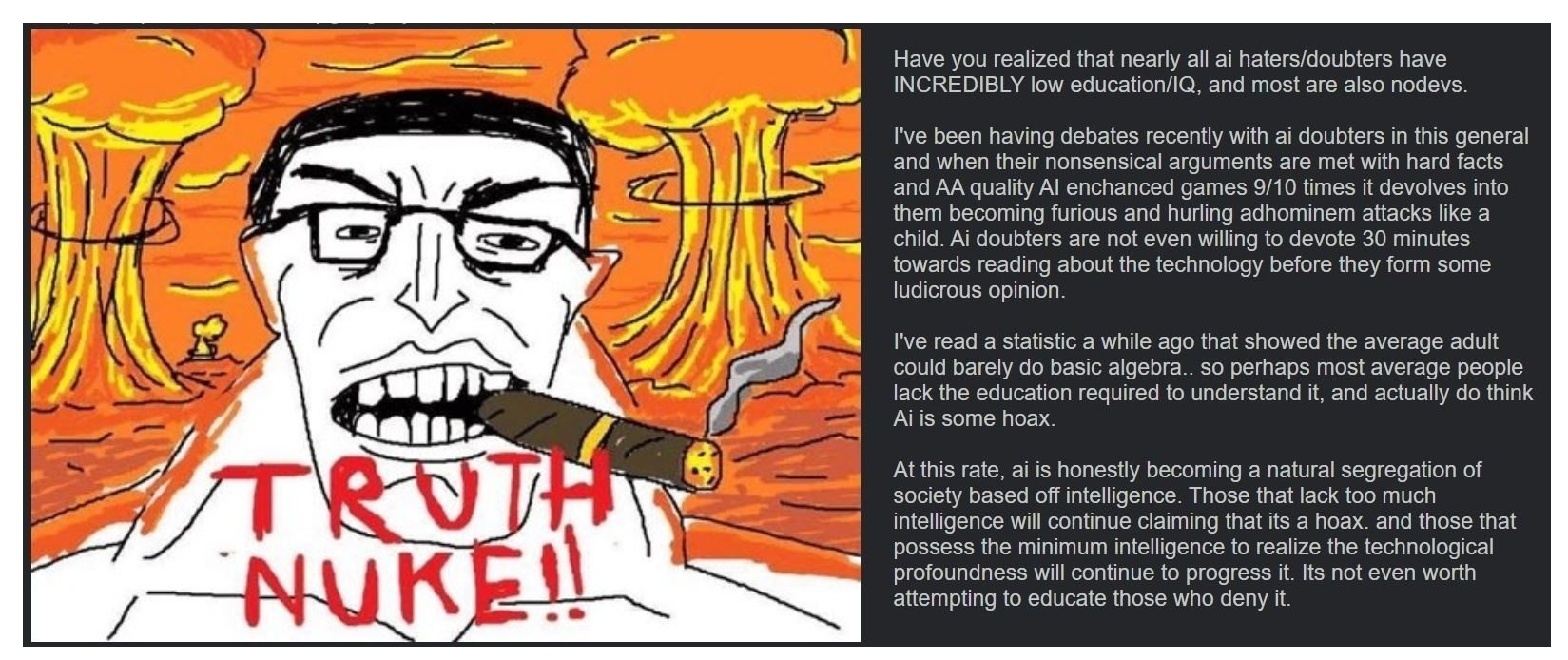 >>108627552based? Despising eco marxist retards does not involve jeets. He's managing to dislike AI for all the most retarded normie smoothbrained slop reasons while missing all the real reasons to be concerned. It's like OP is low tier LLM slop but in retard form