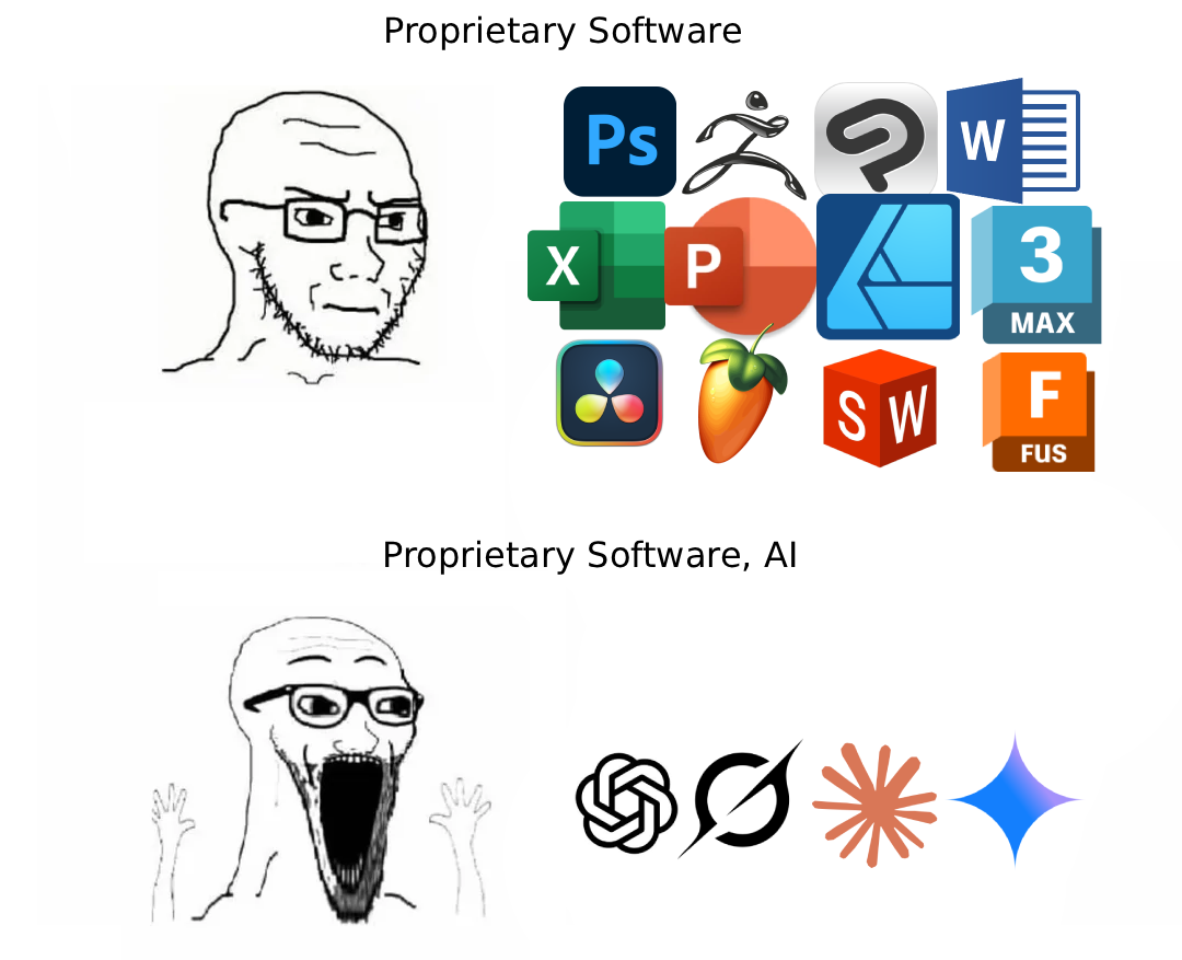 I like opensource, but I like it from a technical perspective. I couldn't possibly care less about the quasi-anarchist political larping that seems to infect it like a plague.I gladly use proprietary software where it works well or is needed. Don't really give a shit about LLMs either other than using it as a search engine essentially.