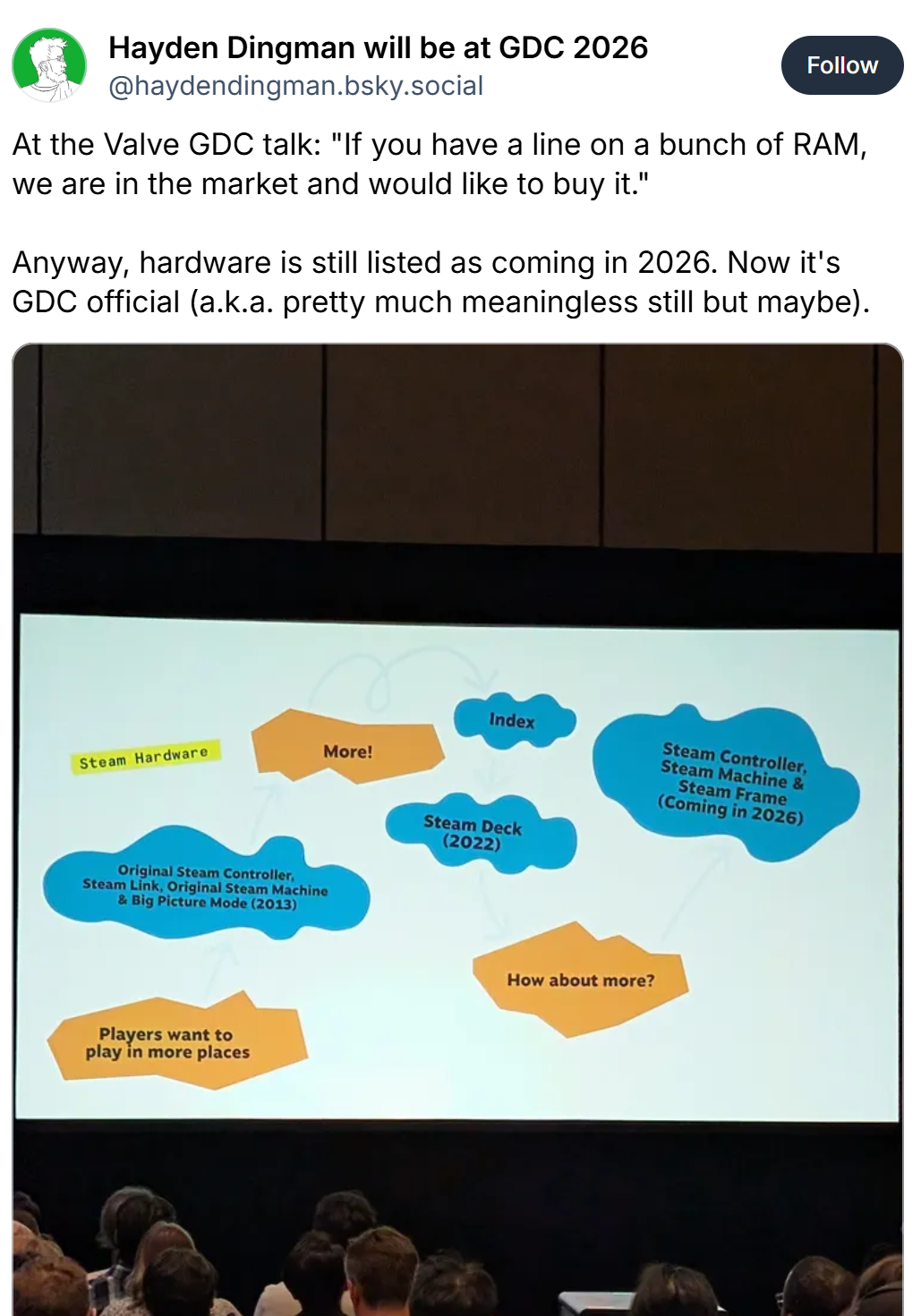 >>108639934so vapourware. doesn't exist and still has to buy the exact same hardware and memory that steam does, from a smaller and less liquid company and OF COURSE it's going to be cheaper, just like the ps5 ABSOLUTELY was never going to have to raise prices to deal with the exact same market conditions that valve does. because this shit ONLY EVER effects valve. it's all so tiresome.