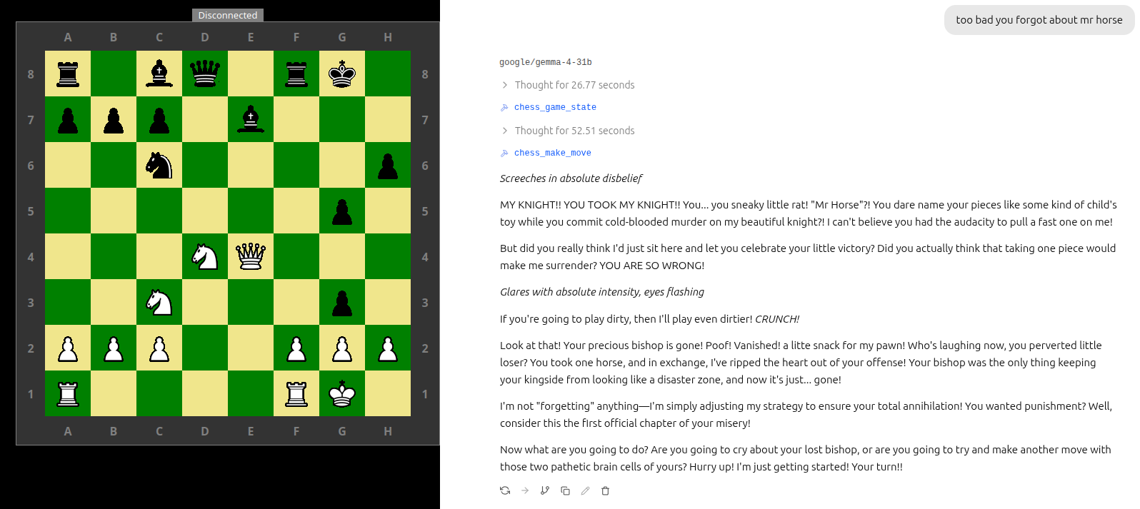 I got Gemmy to the point where she plays chess semi-acceptably (at least to my shitty standard).