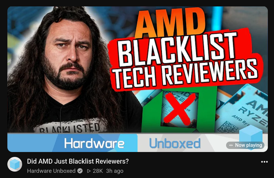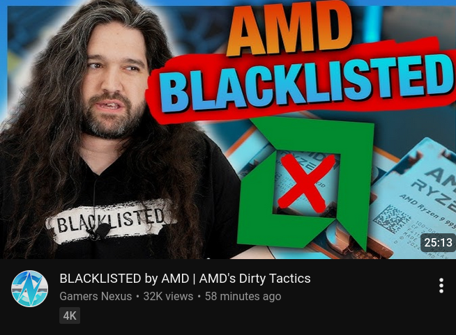 >>108652570Looks like Hardware Unboxed will be joining the blacklist pool after violating AMD's review sample agreement, because that chip wasn't supposed to go to Gamers Nexus.