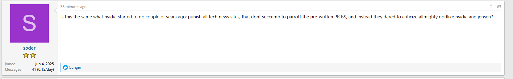 >>108658829Didn't he make a "documentary" about how the evil Chinese steal NVIDIA chips?While at the same time the chinese government banned nvidia chips.And Bloomberg being Chinese spies that DMCA strike him because he goes after their Chinese master?While at the same time Bloomberg was only jealous about their own anti-China documentary doing less good than his?Steve throws weird accusations around and is wrong most of the time. Like here as well: >>108656651And you see the simps not getting that: >>108657224It doesn't matter whether or not some rare dude got a free gift, the fact that most of the reviewers didn't get gifts is enough evidence to prove Steves theory, that AMD would be mad at him for doing political rants, wrong.