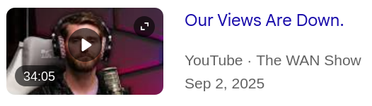 >>108653630I watch a lot of the tech content, myself. It is only Steve that is acting this way.So what if there is only 3 CPU launches this year.Jayztwocents has just put out a vid on Bios settings.>>108653656I seem to remember him buying that big airflow testing machine, with subscriber and shop money and saying they need 6 months to get trained on how to use it. Unboxed it on video.They never mentioned it again.Linus got slayed for the same thing.