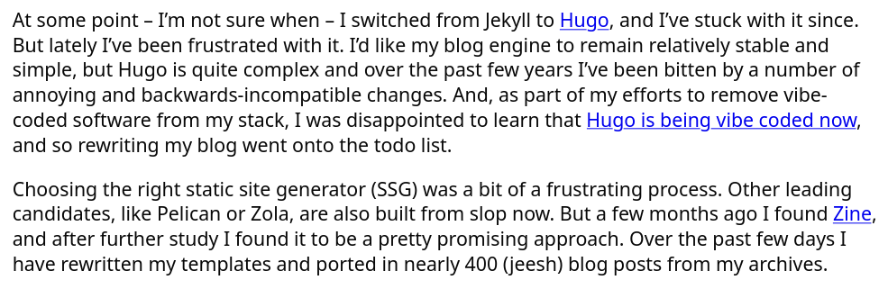 This guy ported 400 of his blog posts because he wanted to switch a static site generator to one that doesn't have AI code in it.
