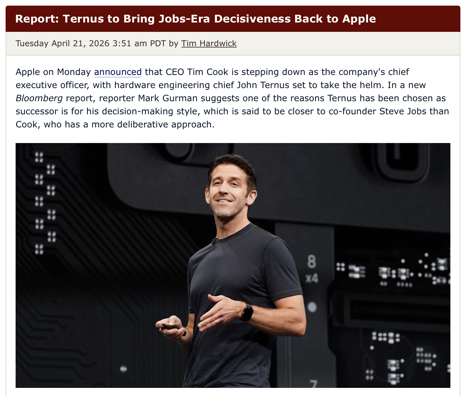 >"Ternus will make decisions" when it comes to product development, said one person who has worked closely with both executives. "If you go to Tim with 'A' or 'B,' he won't pick. He'll ask a series of questions instead if he has concerns.">Ternus, on the other hand, will choose, said the person, who asked not to be identified in order to speak candidly. "It could be right or wrong, but at least it's a decision.">That shift could mark the end of an era in which major product decisions were made collectively by a small group of top executives. Ternus is expected to take a more centralized approach where he will be a singular decision-maker.